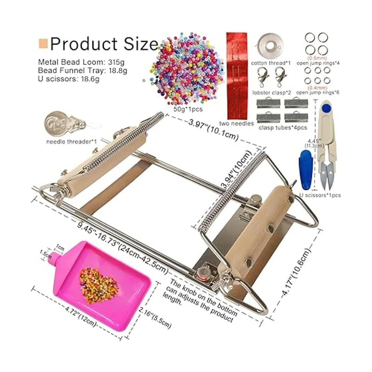 Tamaño: telar de cuentas de metal, largo 9.4516.73 pulgadas, ancho 4.17 pulgadas; enhebrador de agujas 1.7 pulgadas; longitud del hilo de algodón 98.4 ft; bandeja de embudo de cuentas 3.7 pulgadas de largo x 2.2 pulgadas de ancho cm;Semilla Cuentas, 1.76 oz; tijeras de hilo 4.7 pulgadas de largo x 0.8 pulgadas de ancho. Anillos abiertos, 0.4/0.024 in.
