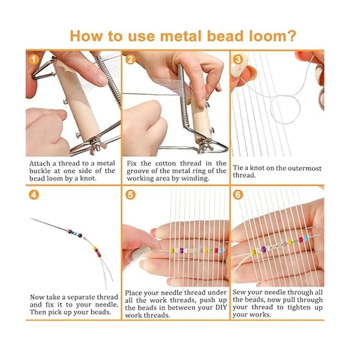 Kit de telar de cuentas de metal: 1 telar de cuentas de metal, 1 enhebrador de aguja, 1 hilo de algodón, 2 agujas, 1 bandeja de embudo de cuentas, 1 bolsa de cuentas de semillas, 1 tijeras de hilo, 1 manual de instrucciones idioma español no garantizado, 2 cierres de langosta, 10 anillos abiertos, 4 tubos de cierre.