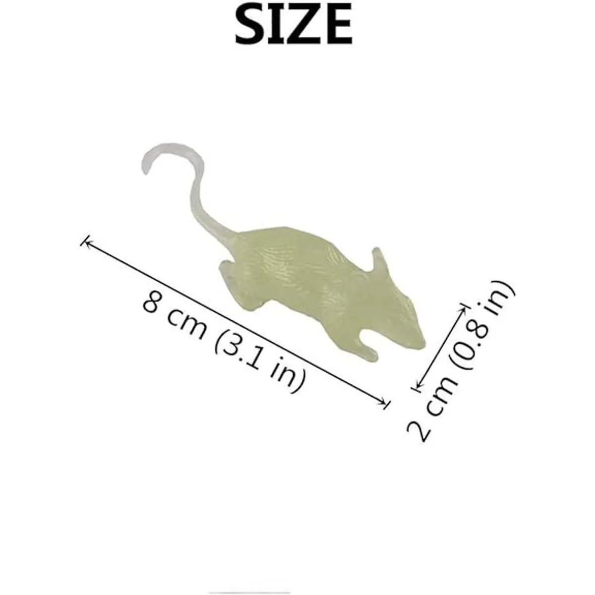 SIZE :Mouse Body size: 82 cm 3.10.8 in.This set small fake mouse include 10 pcs green glow in the dark mini mouse.