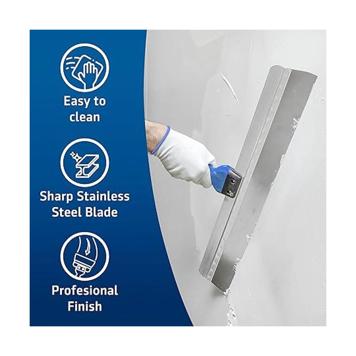 Cuchillo de cinta inoxidable de la más alta calidad: la hoja está hecha de acero inoxidable sólido, resistente a la corrosión. Se ha fabricado utilizando prácticas de fabricación premium. El perfil de aluminio garantiza que nuestro cuchillo de cinta permanezca perfectamente recto y flexible. Es la herramienta ideal para pegar paneles de yeso.