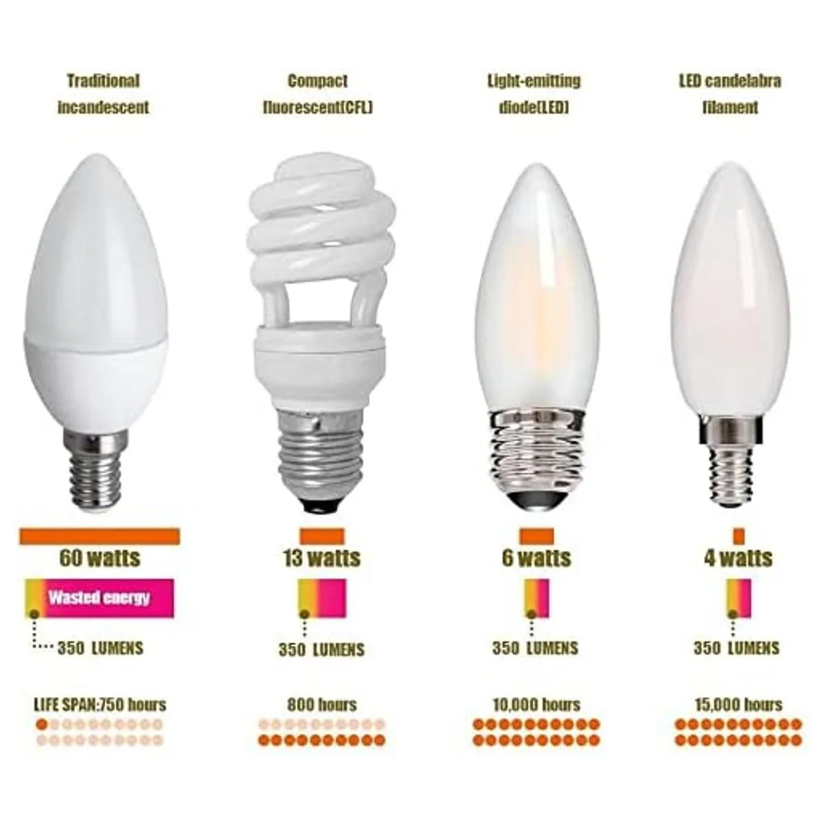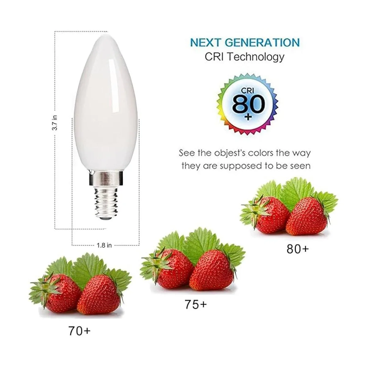 La tecnología profesional conduce a una calidad extraordinaria: las bombillas LED de candelabro E12, sin parpadeo, antirreflejos, son perfectamente adecuadas para la iluminación del hogar, como kicthen, dormitorio, baño, sala de estar, comedor, almacén de casa, etc. Peso ligero; elegante forma de vela B10; fácil de instalar con base E12; el cristal blanco lechoso es fácil de lanzar un maravilloso brillo cálido en todas las direcciones. Nota: el color de la iluminación a través del vidrio tintado blanco lechoso es más amarillo que la bombilla LED de vidrio transparente