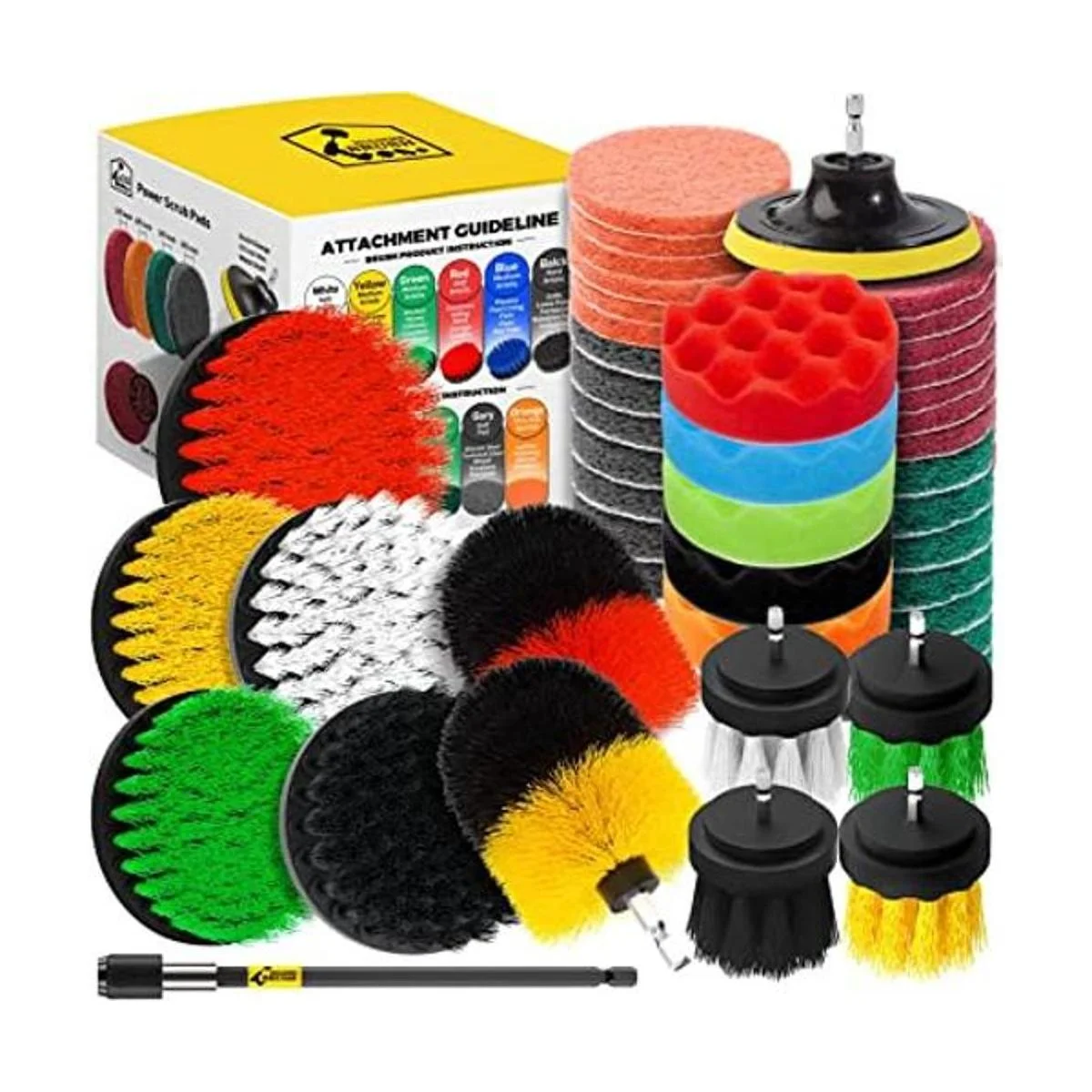 Juego de accesorios de limpieza de taladro de 45 piezas cepillo y almohadillas de fregado y esponja de exfoliación, incluye: 11 piezas de juego de cepillos de taladro de diferentes propósitos, 27 almohadillas de fregado de rigidez diferentes, 5 esponjas de fregar con respaldo de 4 pulgadas y 1 accesorio de alcance extendido