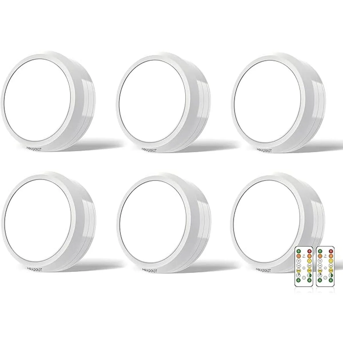 HOLKPOILOT Luces de techo con control remoto, iluminación debajo del gabinete, funciona con pilas, iluminación de disco debajo del gabinete, luces de gabinete de cocina, luces inalámbricas para pegar en blanco paquete de 6