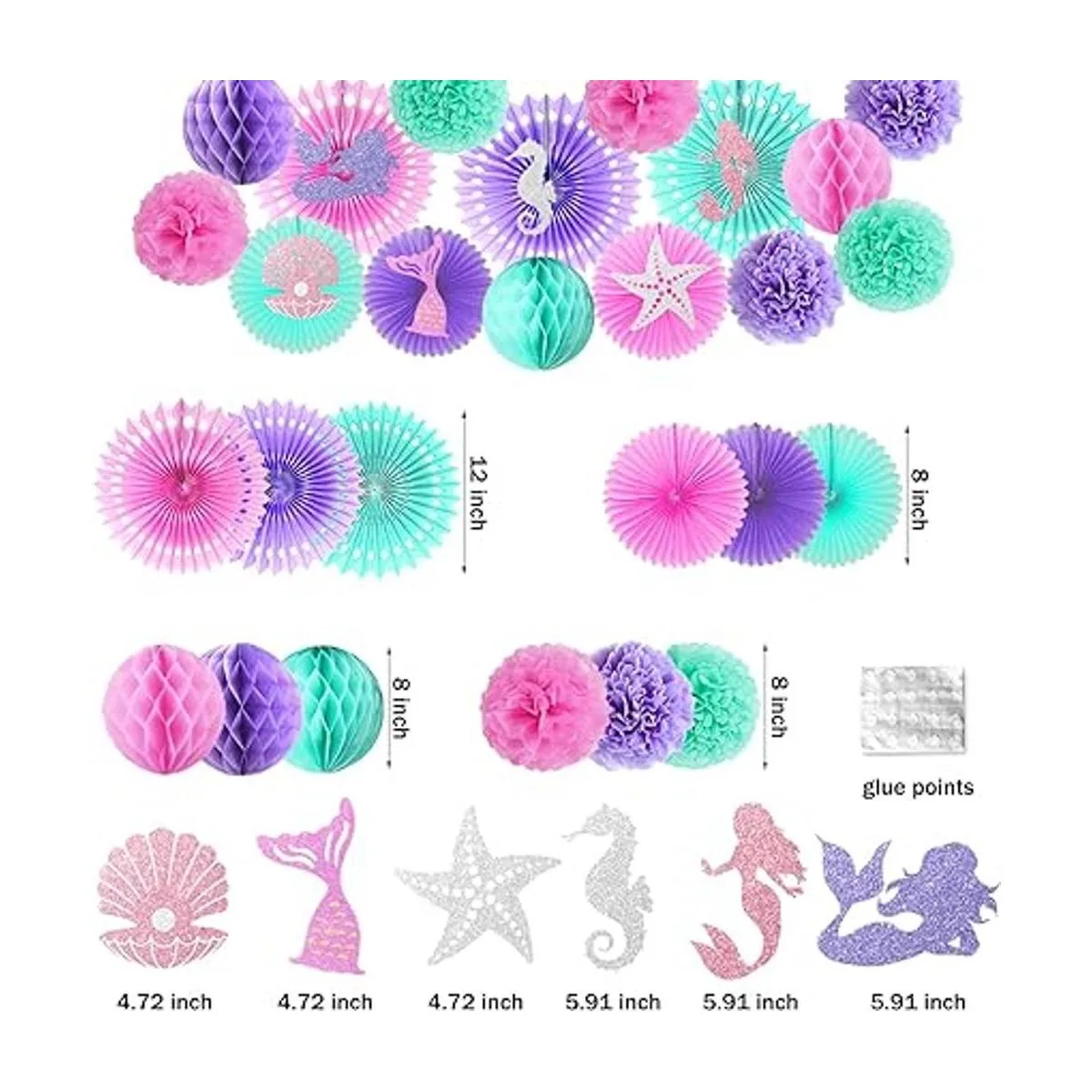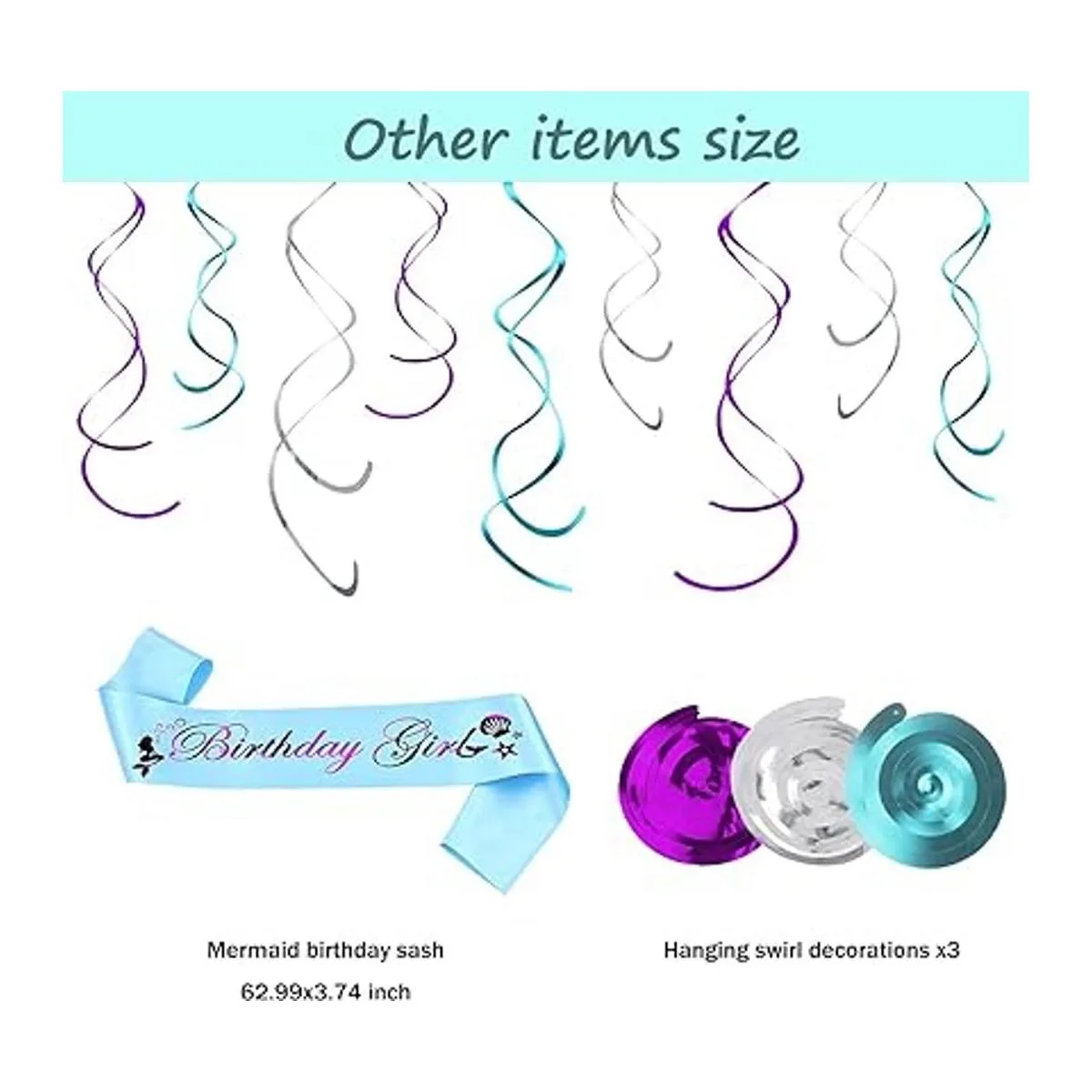 Rápido y fácil de montar: la pancarta de sirena necesita cuerda, simplemente despliega y cuelga, el remolino está precortado. Se incluyen palos y pegamento de puntos para hacer una bonita decoración de sirena. Todo lo que quieres está en el paquete