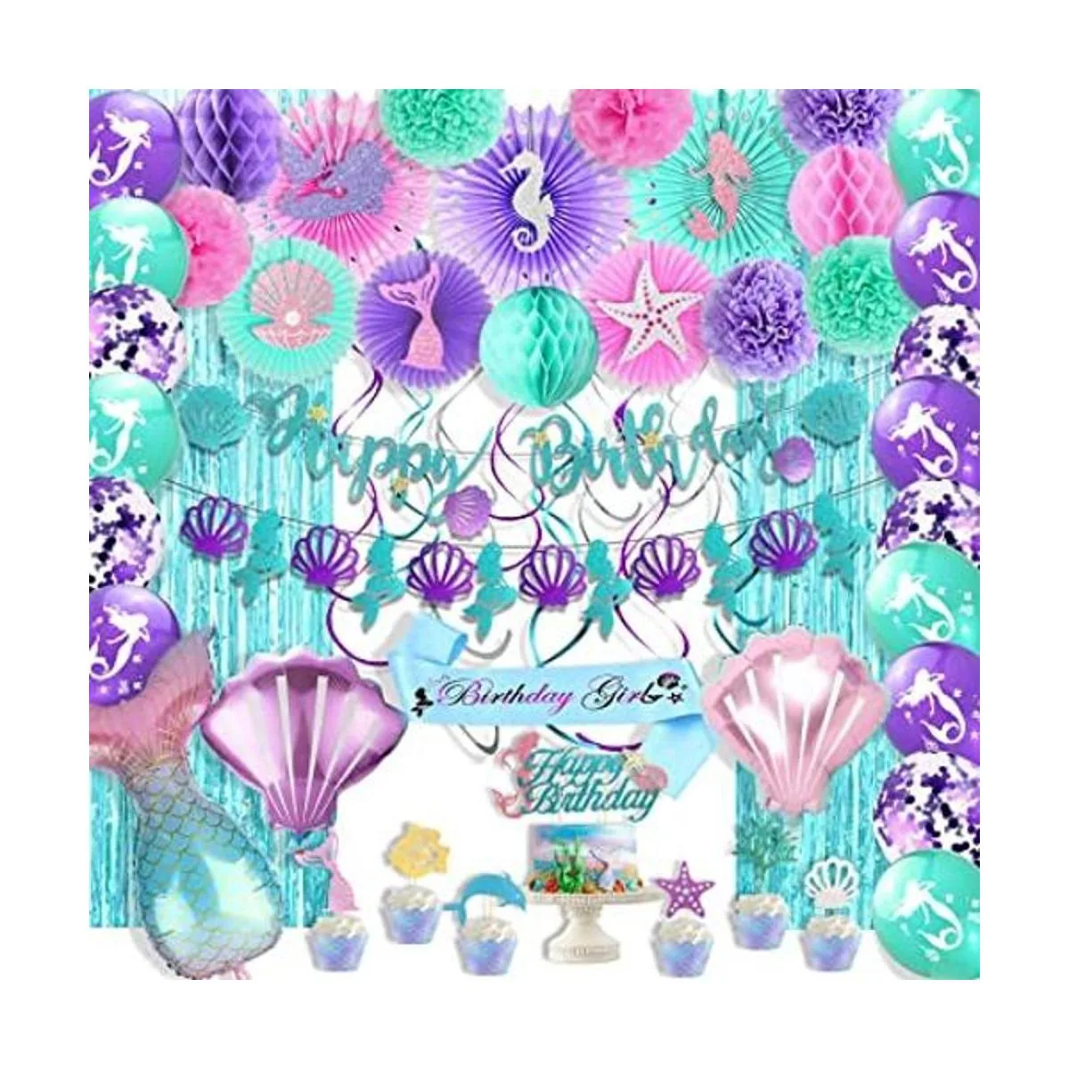 Las decoraciones de cumpleaños de sirena incluyen: 2 pancartas de feliz cumpleaños/sirena, 1 decoración de pastel de sirena, 6 decoraciones de cupcakes de sirena, 2 globos de aluminio de concha morada/rosa y cola de sirena, 15 abanicos de papel Tiffany azul/rosa/morado o pompones en diferentes tamaños, 6 piezas de sirena/cola/shall/hipocampus/estrella de mar, 15 piezas de 10 pulgadas estampado de sirena/morado Globos de confeti, 2 Cortinas de flecos metálicos azules, 9 espirales colgantes Tiffany azul/plateado/morado, 1 banda de sirena.