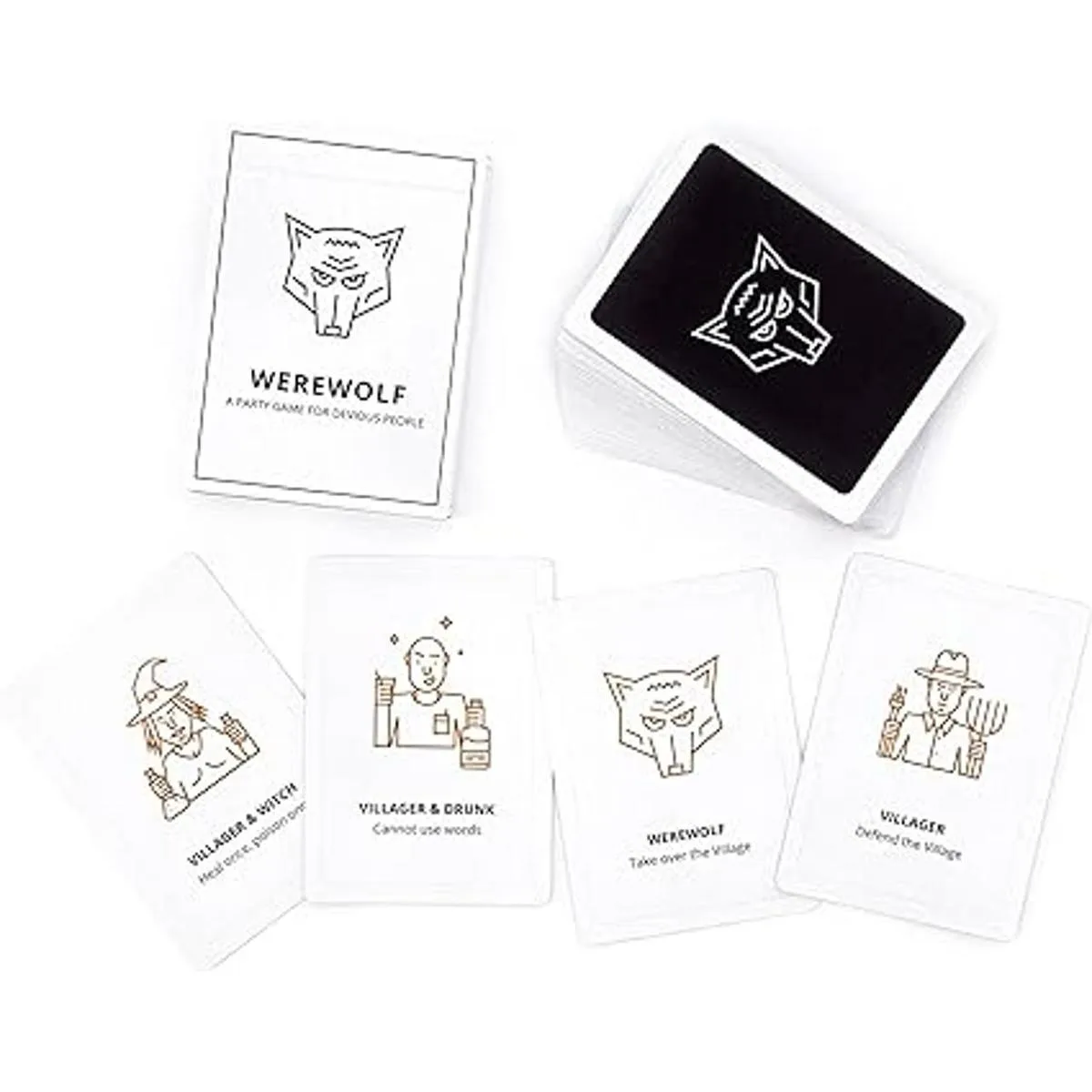 20 Villager tarjetas, 10 tarjetas de hombre lobo, 8 tarjetas de Wild, 2 tarjetas de seer moderador, 2 tarjetas de Doctor, 2 tarjetas, 2 Village Drunk tarjetas, 2 tarjetas de bruja, 2 Alpha tarjetas de hombre lobo