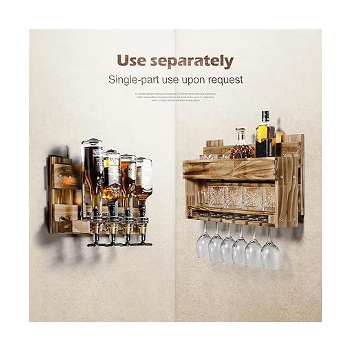 Homde Estante de vino de madera montado en la pared con soporte de vidrio para botellas, estante de almacenamiento rústico con dispensador de licor de 4 botellas para decoración del hogar, bar, cocina