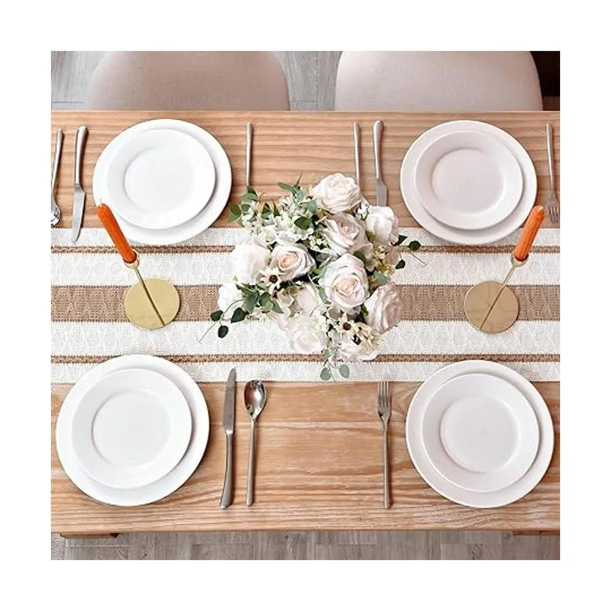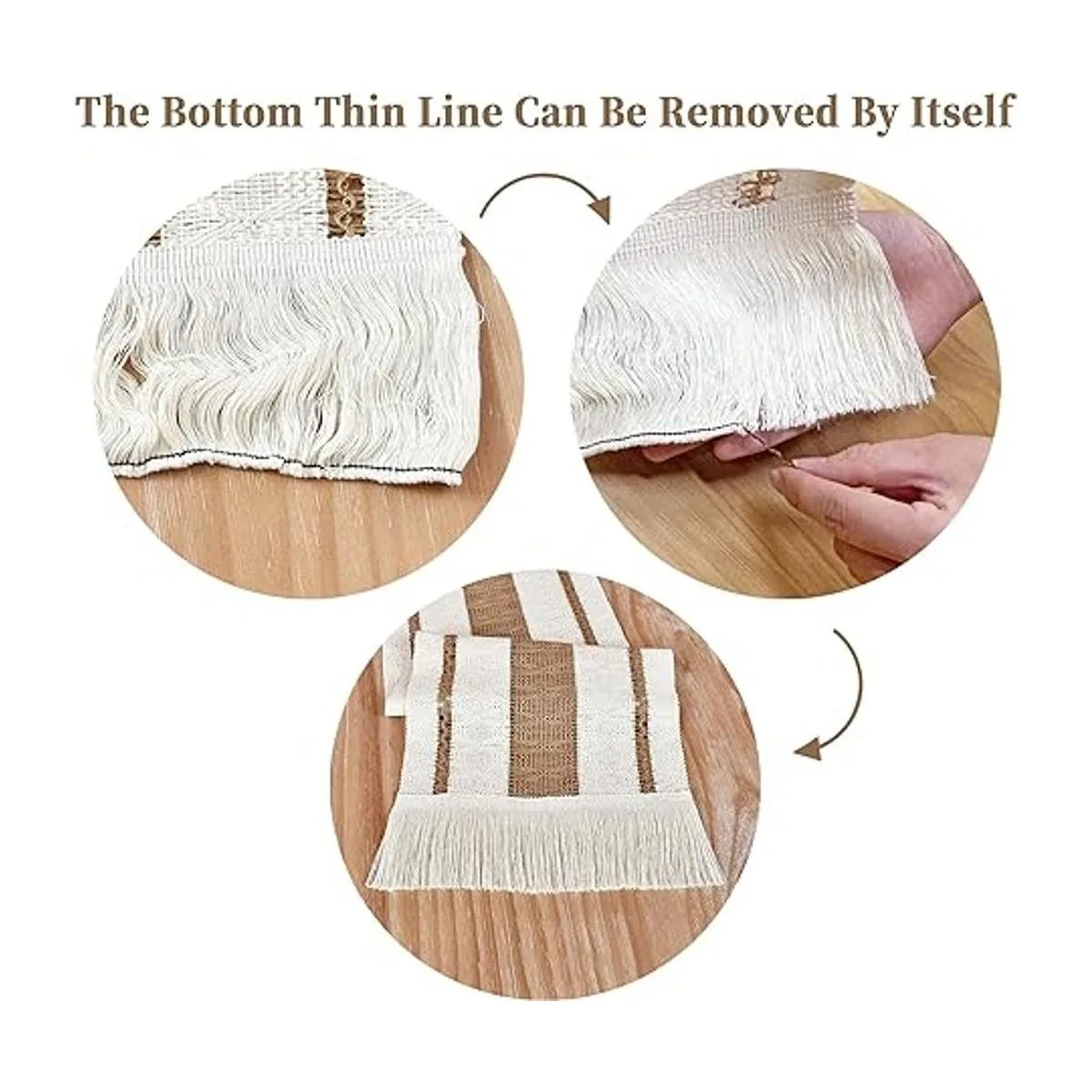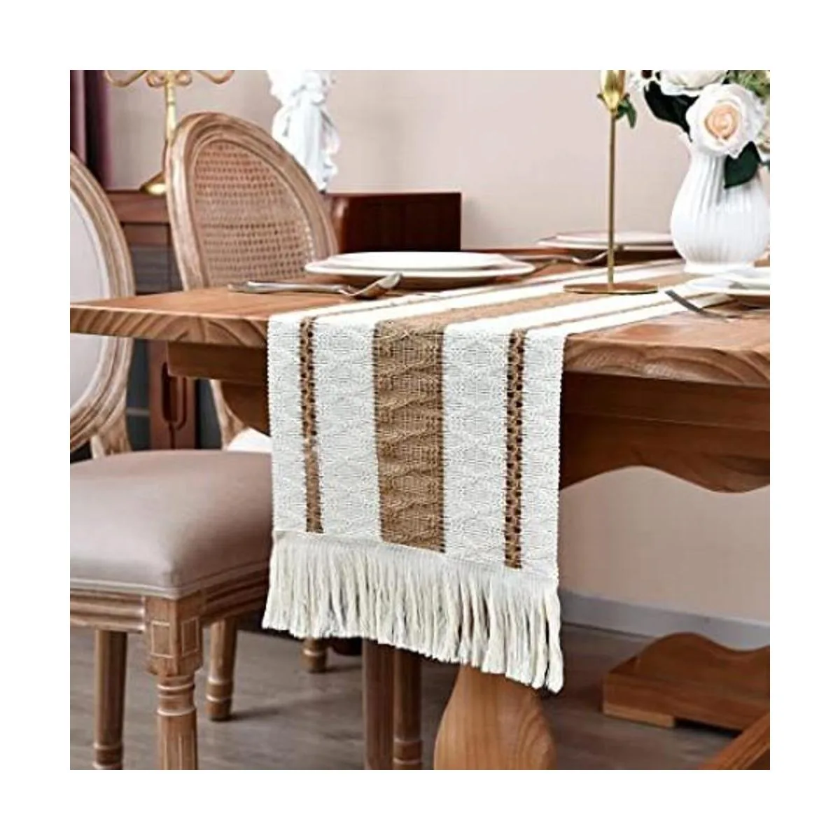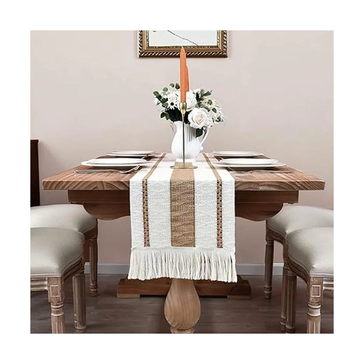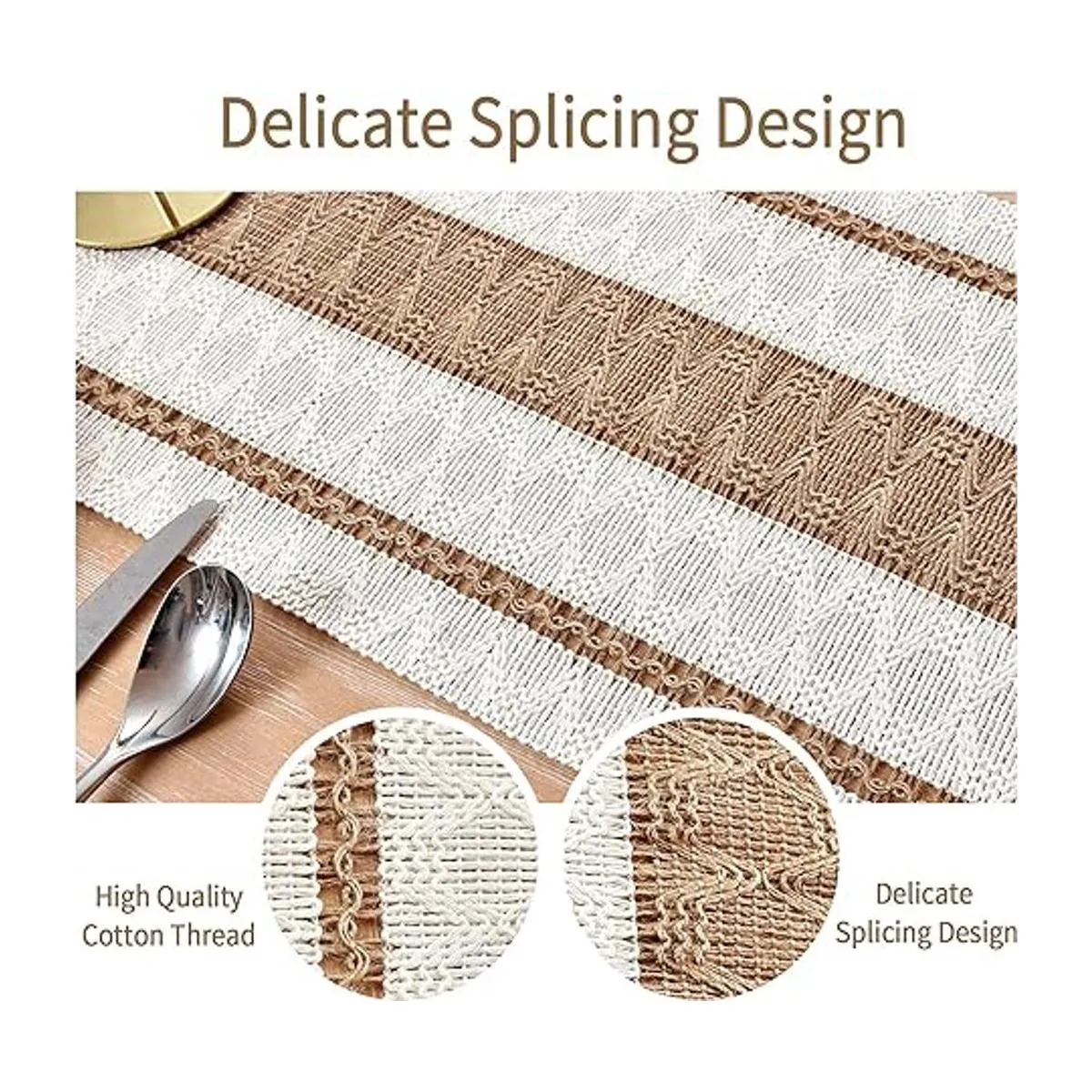 Diseños delicados: el camino de mesa de arpillera cuenta con un delicado tejido de algodón a rayas huecas beige y arpillera con borla, con un toque minimalista y un encanto bohemio, para darle a tu mesa un nuevo aspecto. Hay una línea protectora en la parte inferior de la borla, que se puede quitar por ti mismo.