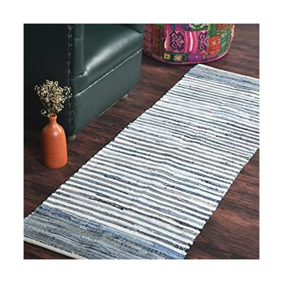 Esta alfombra de mezclilla es elegante y completamente reversible y extremadamente duradera.