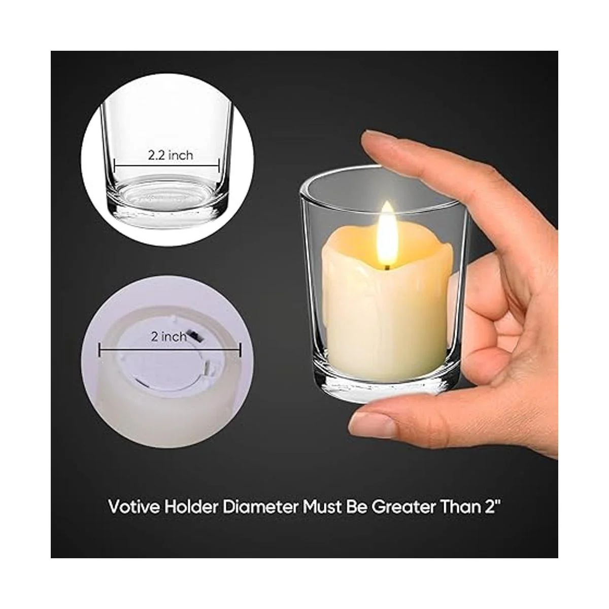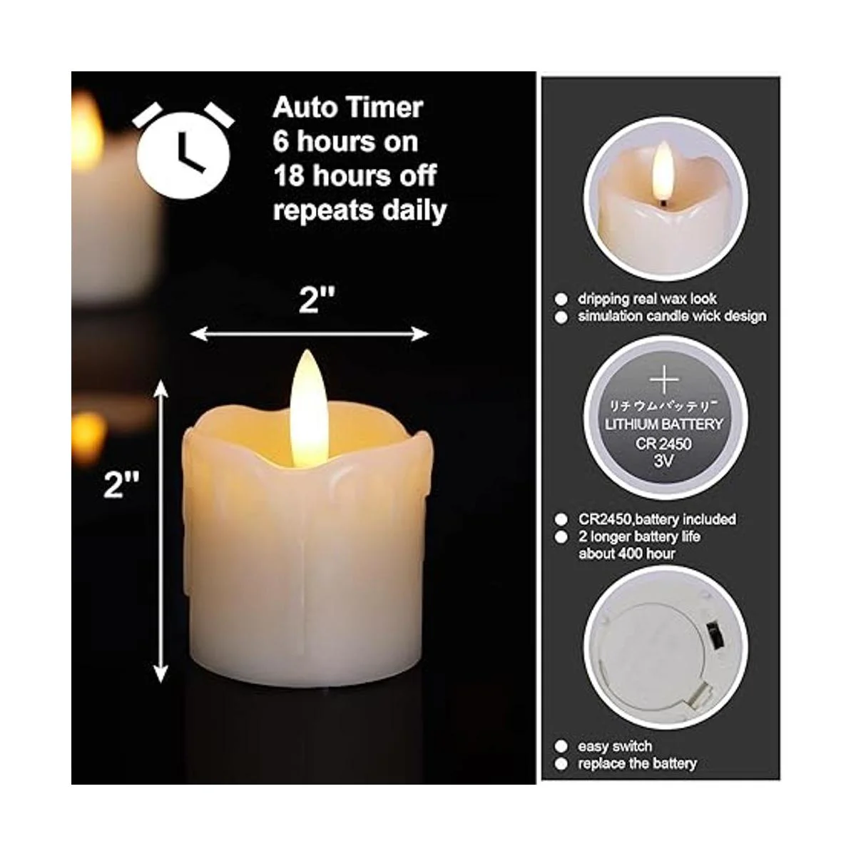 De mayor duración y pilas incluidas: estas velas falsas funcionan con pilas, necesitan 1 pila tipo moneda CR2450 incluida por vela. Las pilas rinden más de 400 horas de iluminación y se pueden reemplazar fácilmente a través de la pestaña en la parte inferior.