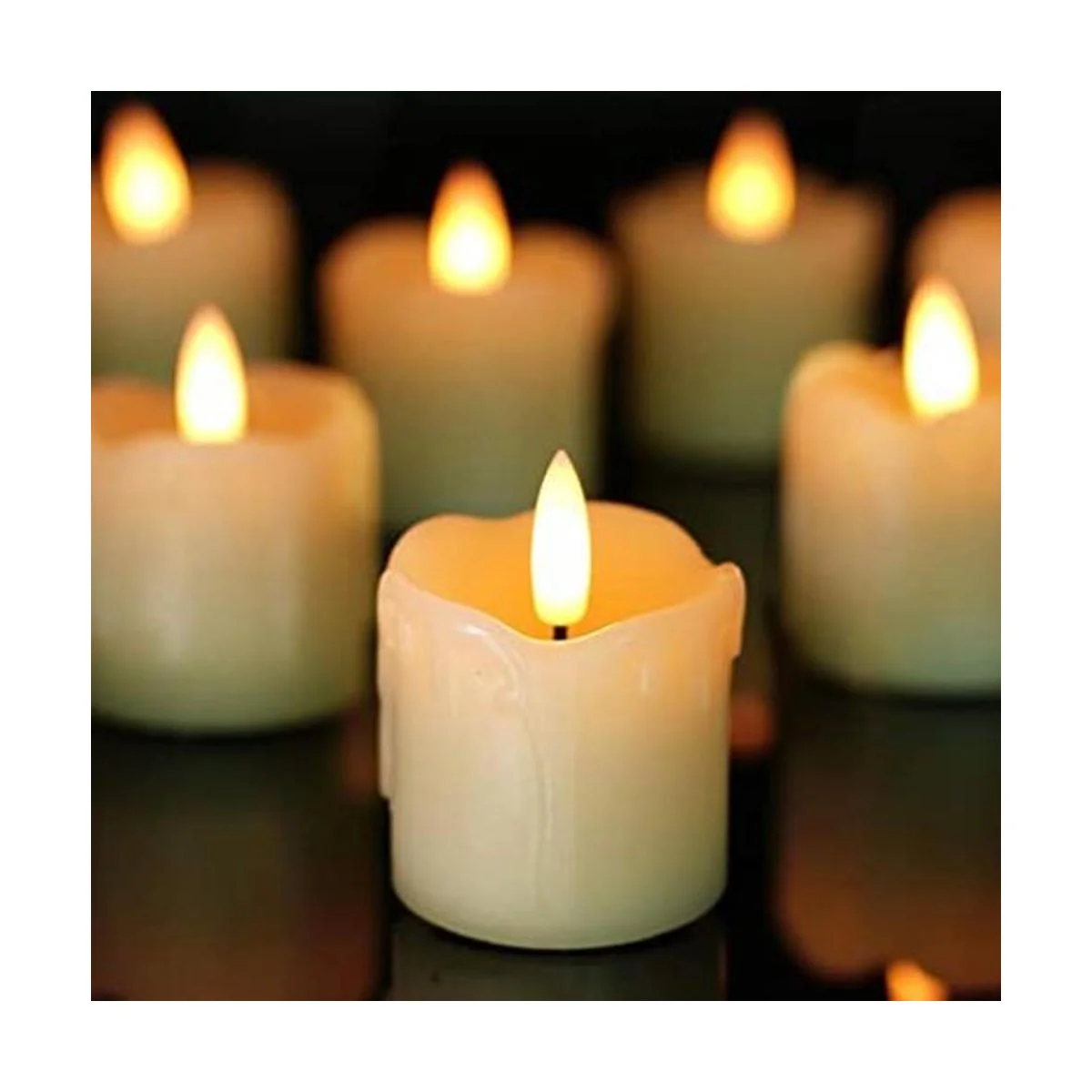 Hechas de cera real: nuevas velas 3D sin llama, cada vela a batería mide 2×2 pulgadas. Diseño de borde derretido, apariencia de gotas de cera real, mecha negra, piezas que simulan la luz de las velas tradicionales, parpadeantes sin llama 3D. Todo esto da un aspecto más vivo y realista, en lugar de quemar velas, estas piezas crean un ambiente suave y relajado.