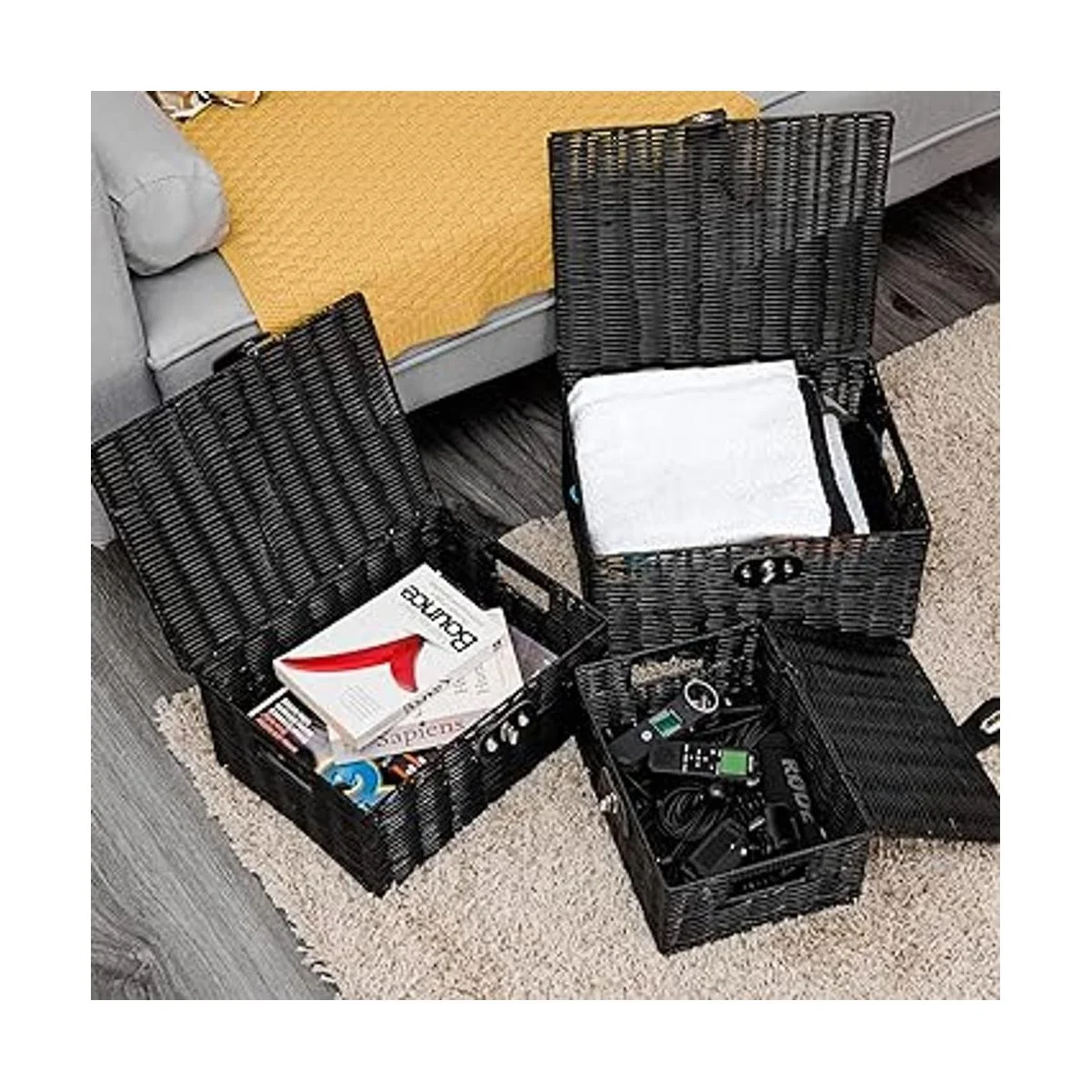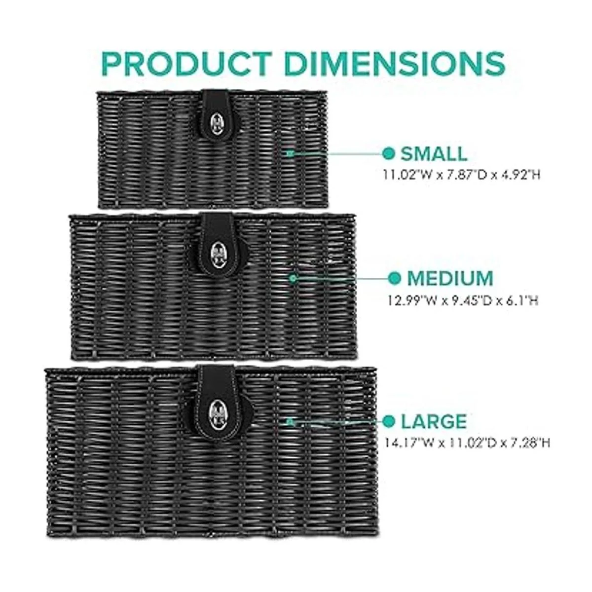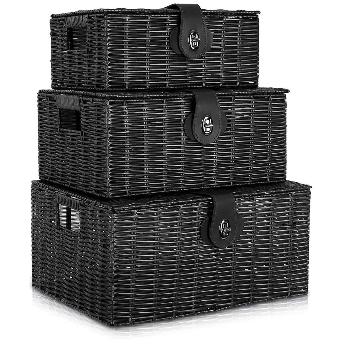 Homepeaz Juego de 3 cestas de almacenamiento tejidas de mimbre apilables con tapa y cerradura, asas de transporte integradas, organizador para guardería, armario de bebé, pañales, juguetes, hogar, oficina, lavandería, DVD (negro)