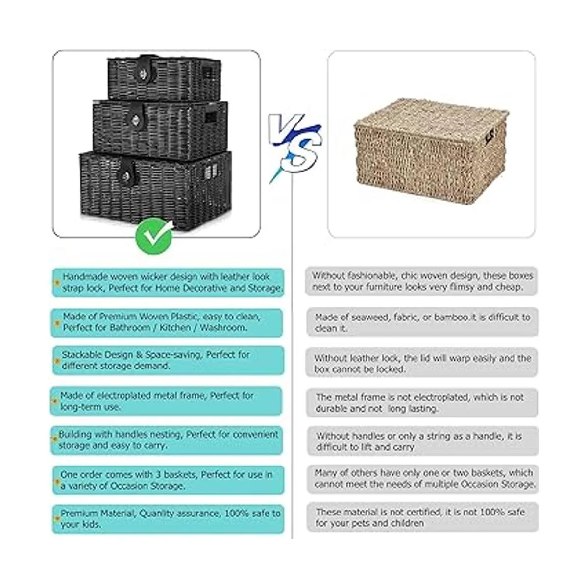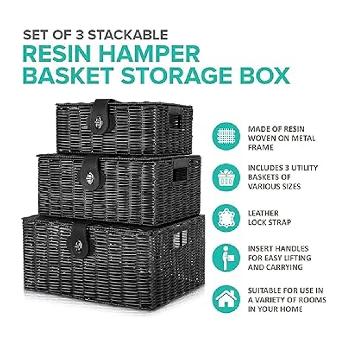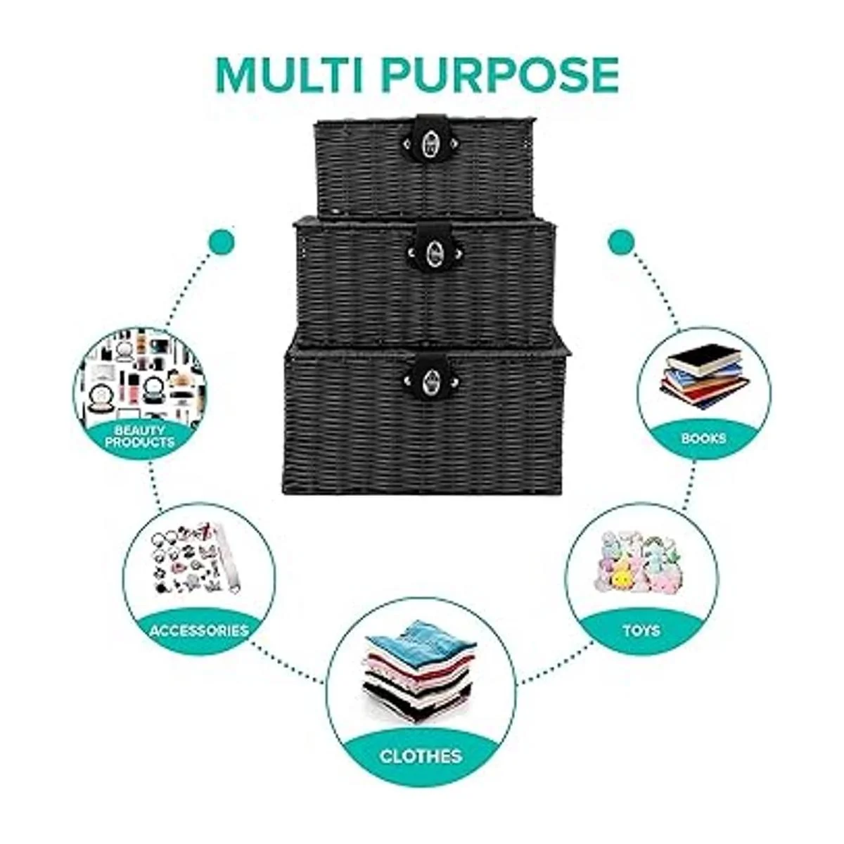 Homepeaz Juego de 3 cestas de almacenamiento tejidas de mimbre apilables con tapa y cerradura, asas de transporte integradas, organizador para guardería, armario de bebé, pañales, juguetes, hogar, oficina, lavandería, DVD (negro)