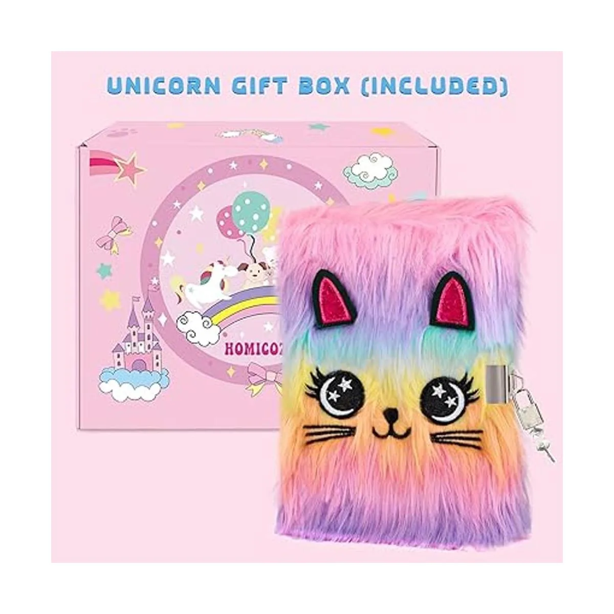 HOMICOZY Diario de gatos con cerradura y llaves para niñas, diario secreto de felpa para niños con 160 páginas forradas, cuaderno de cierre esponjoso de tapa dura para escribir y dibujar, bonitos regalos estacionales mullidas para niñas de 6 años en adelante