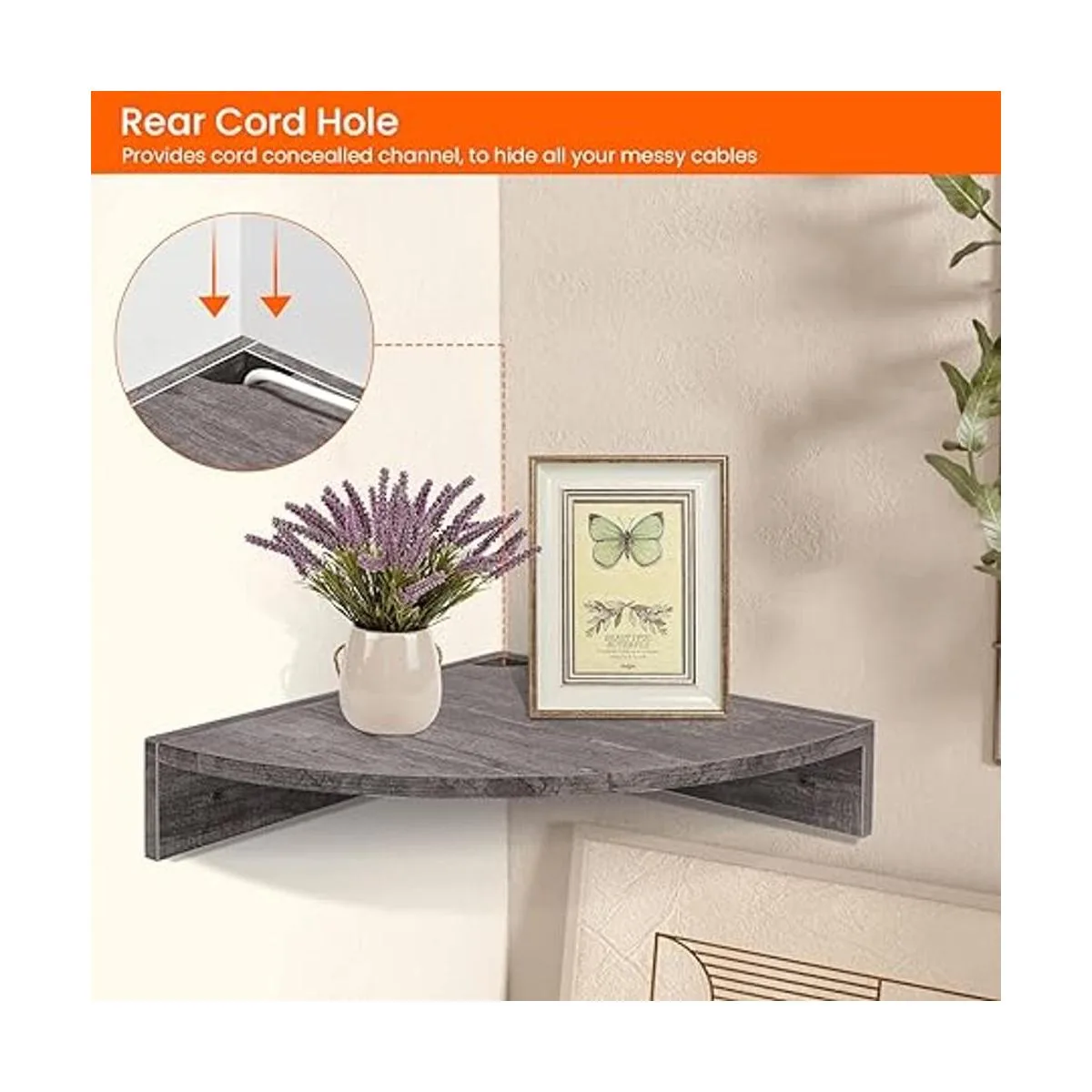 Ideal para la gestión de cables: el estante flotante de esquina tiene un agujero de cable en la esquina, que proporciona un canal oculto de cable, para ocultar todos tus cables desordenados; 3 estantes de diferentes tamaños con profundidad de 10.8 a 12 pulgadas son lo suficientemente anchos como para acomodar las cámaras de seguridad de tus dispositivos, monitores de bebé, relojes despertadores, altavoces, routers y accesorios de TV