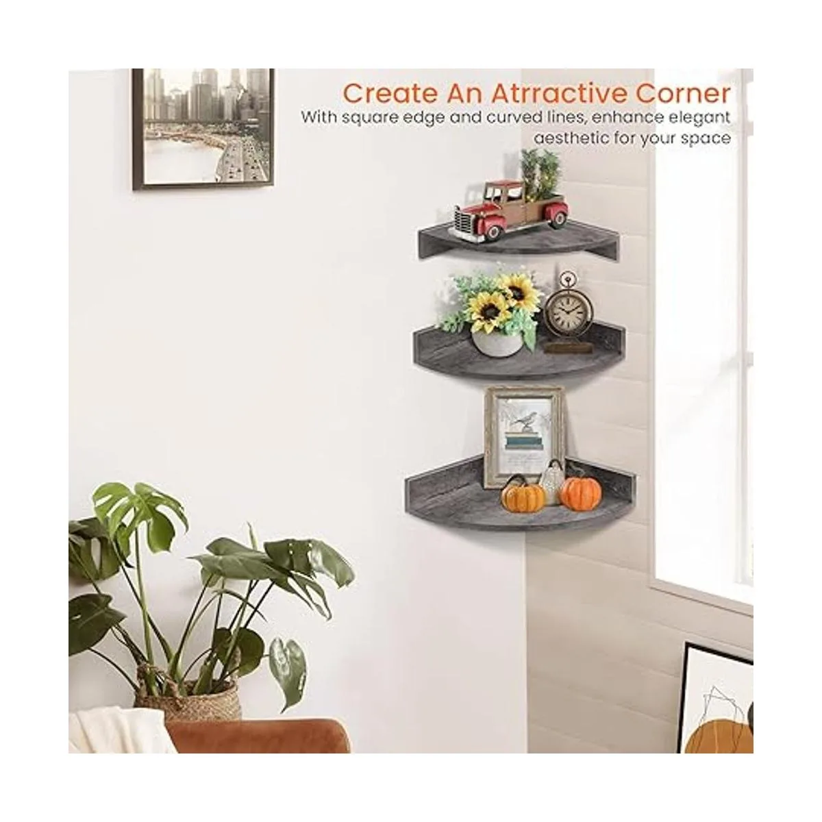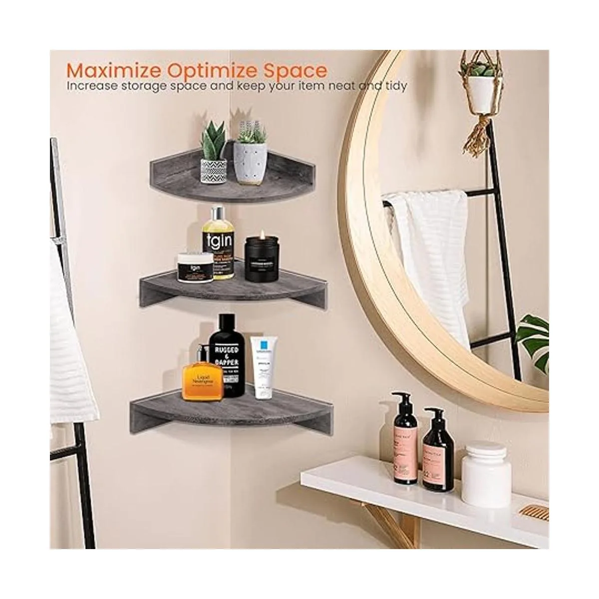 Maximiza el espacio de tu habitación: el juego de 3 estantes de pared de esquina hace pleno uso de las esquinas en blanco de tu habitación para aumentar más espacio de almacenamiento, mantener tu habitación organizada y ordenada, reduciendo el desorden, también destacando tu decoración rústica. Una gran adición a tu sala de estar, baño, cocina y oficina