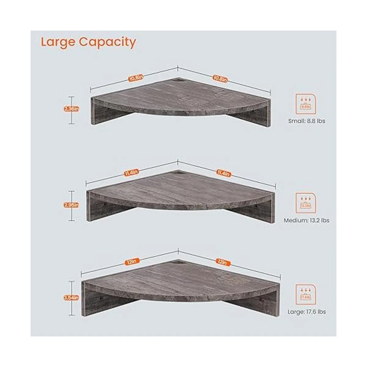 Construcción resistente: el estante de esquina flotante está hecho de tablero de partículas de alta calidad con chapa de melamina, borde de madera de 2.36 a 3.54 pulgadas que proporciona apoyo adicional, lo que garantiza durabilidad duradera y capacidad de carga; grande: 17.6 libras; mediano: 13.2 libras; pequeño: 8.8 libras