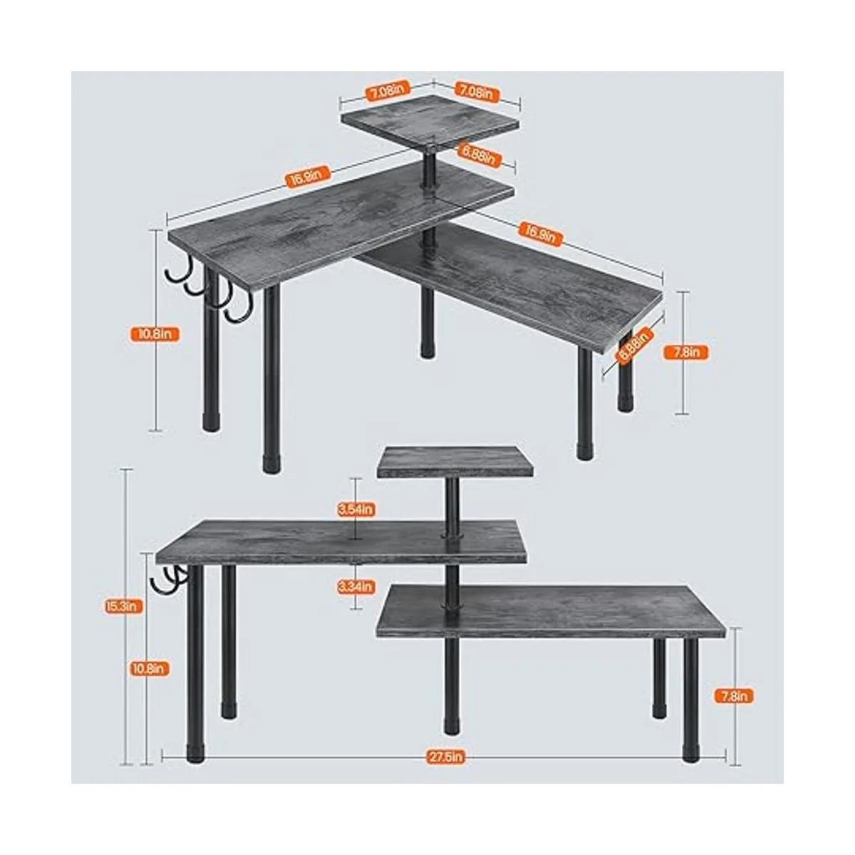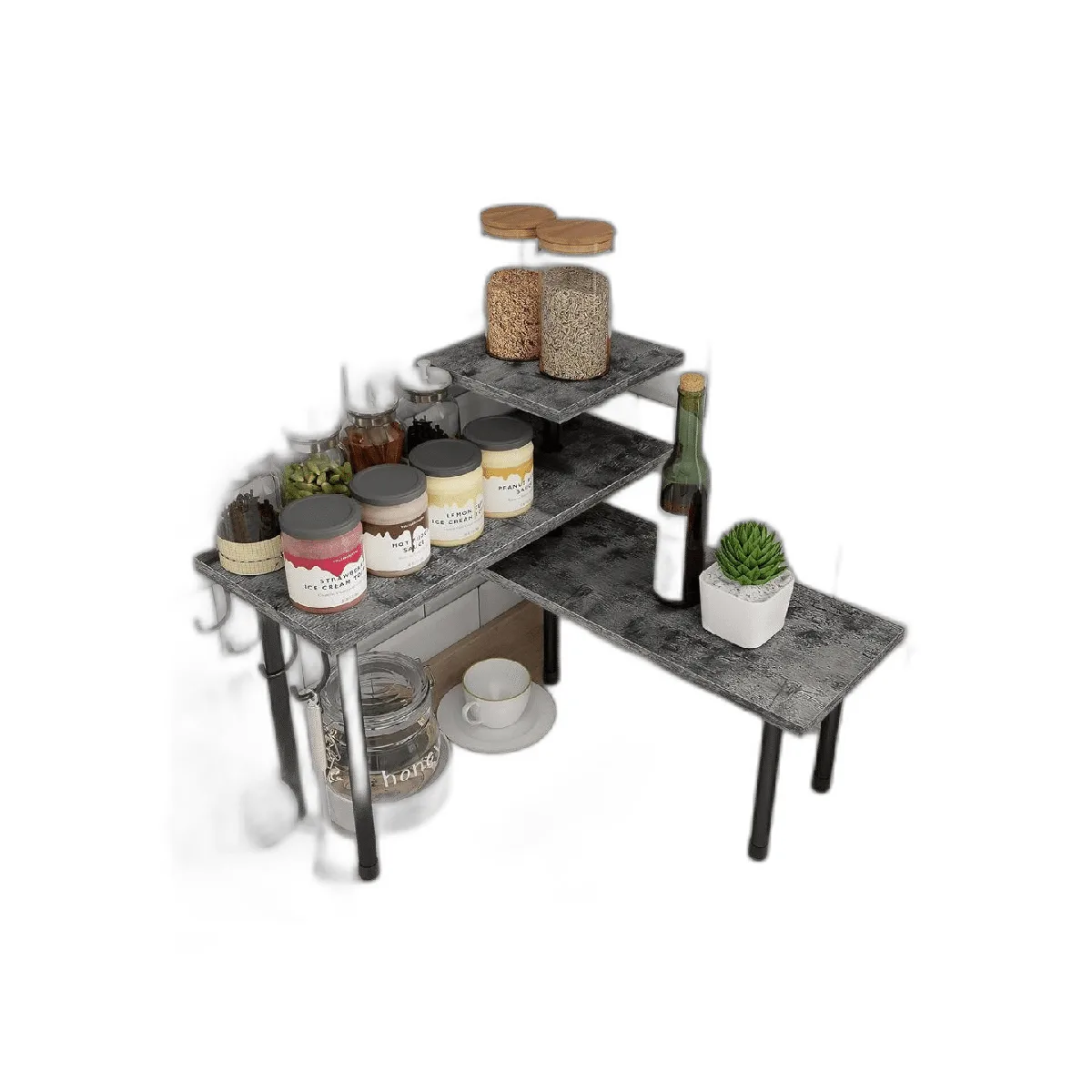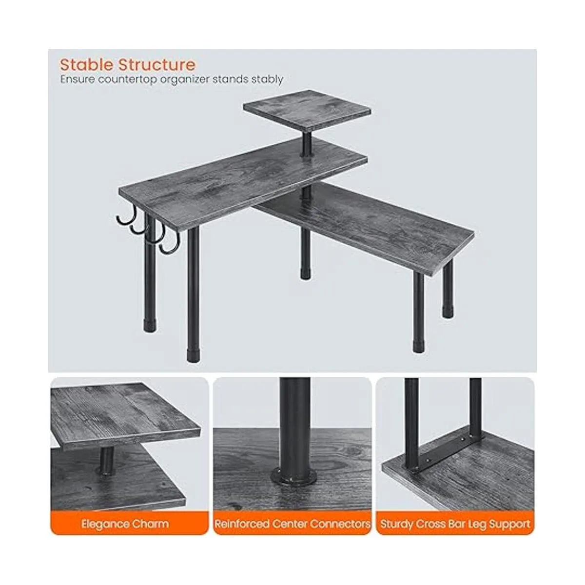 Elegante y elegante: superficie gris rústica para un aspecto clásico antiguo, hierro negro rígido para un estilo industrial chic, ahora se unen en este organizador de encimera de esquina para dar un toque delicado a tu hogar