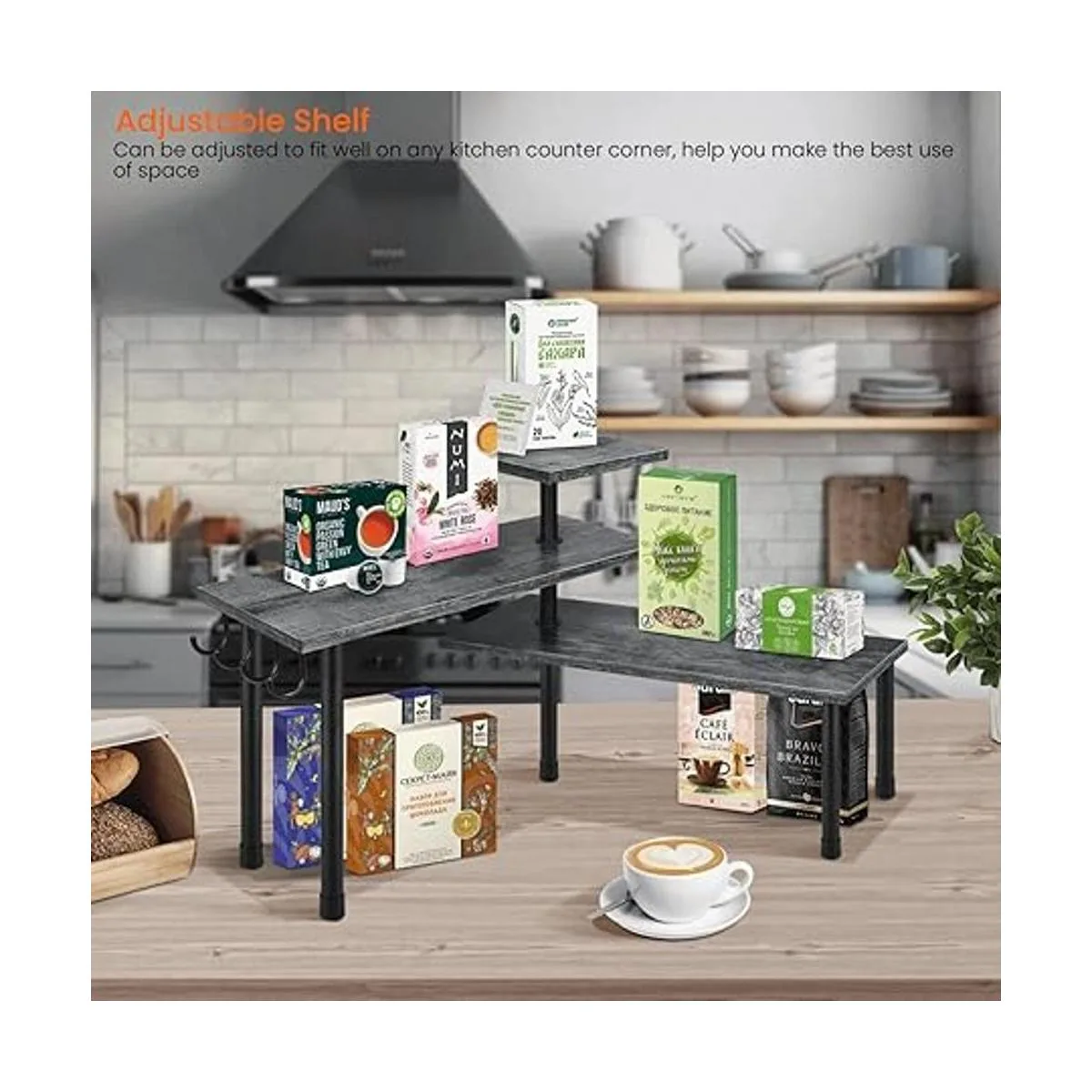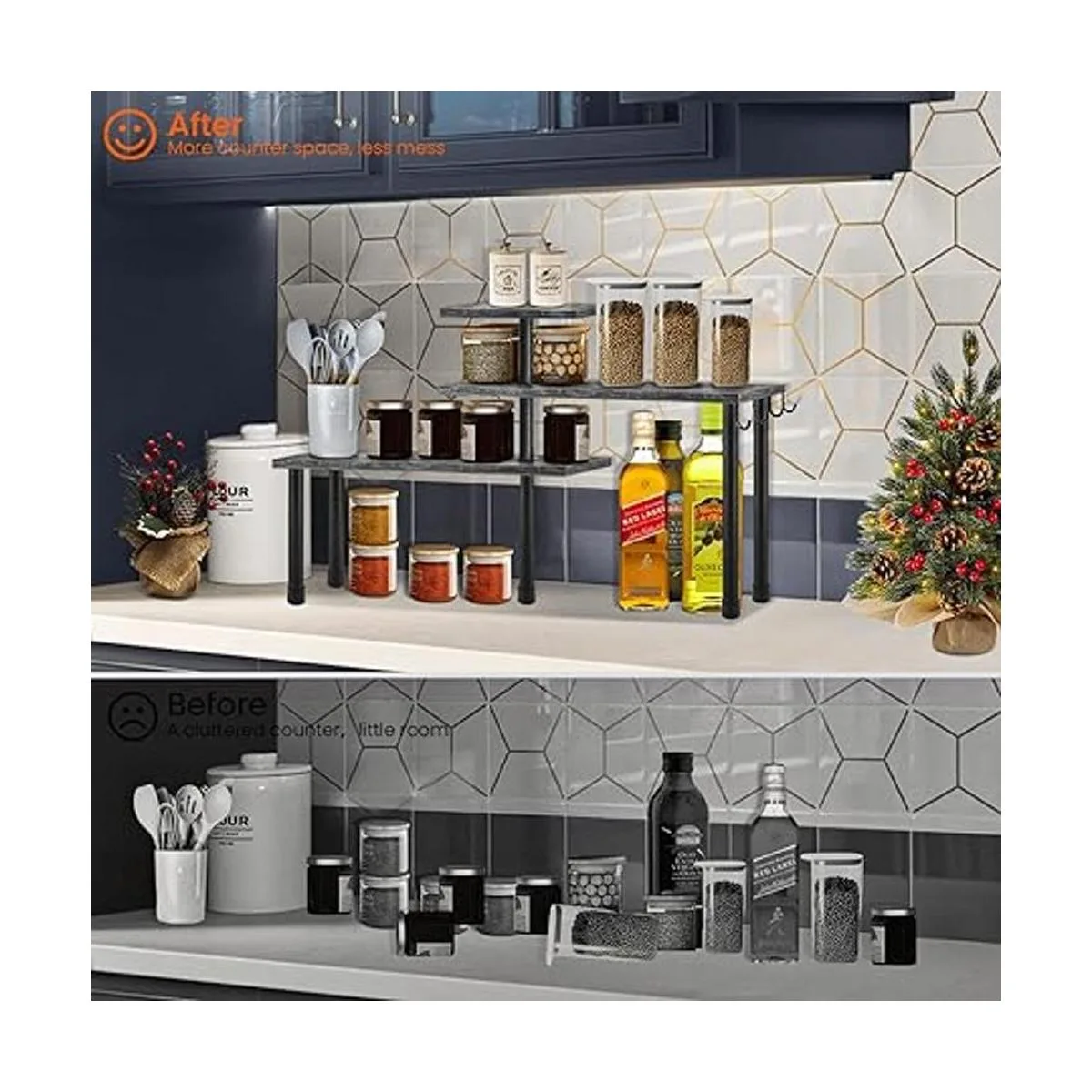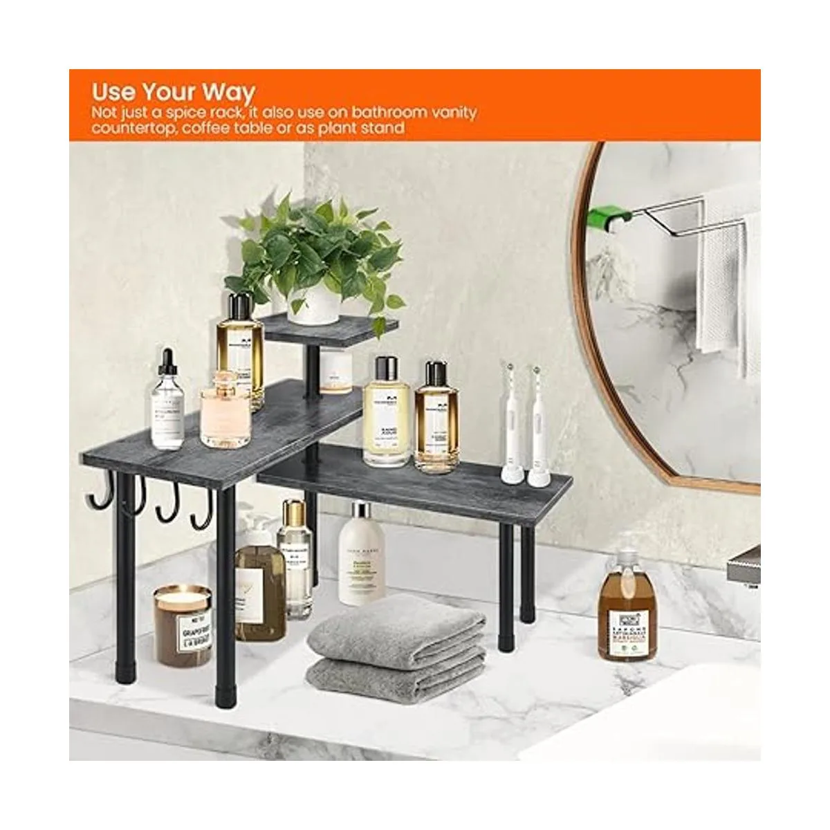 Elegante y elegante: superficie gris rústica para un aspecto clásico antiguo, hierro negro rígido para un estilo industrial chic, ahora se unen en este organizador de encimera de esquina para dar un toque delicado a tu hogar
