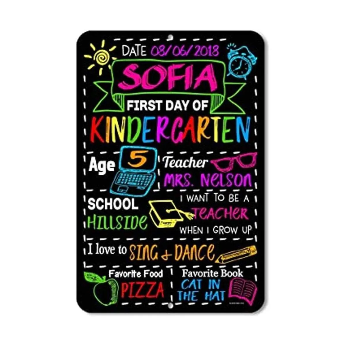 Este primer día de la tabla preescolar parece una pizarra, pero está hecha de materiales de estaño duraderos. Se trata de una pizarra de borrado en seco. Puedes personalizar los detalles del primer día de escuela de tu hijo desde el preescolar incluso hasta el 12 grado. Qué gran manera de comenzar cada año escolar