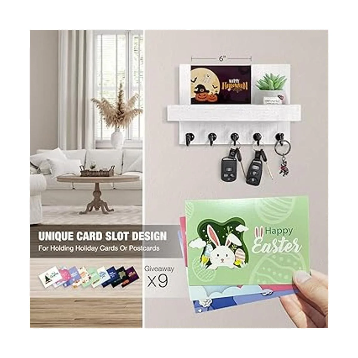 Diseño único de ranura para tarjetas: HONJIN El soporte para llaves para decoración de pared está diseñado con una ranura para tarjetas de 6 pulgadas que puede almacenar tu tarjeta de vacaciones o postal. Además, también recibirás algunos diseños festivos diferentes de tarjetas como regalo.
