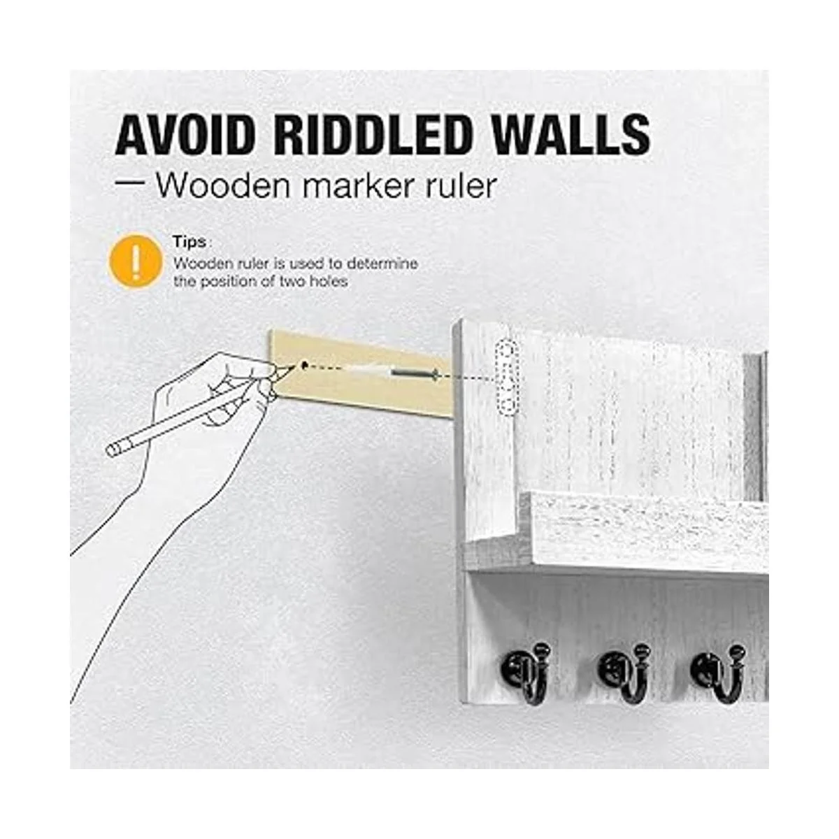 Fácil de instalar: Estamos equipados con una regla de madera que se utiliza para determinar la posición de dos agujeros para evitar paredes acribilladas. Nuestro soporte para llaves para pared se puede instalar fácilmente en la pared con los 2 ganchos incluidos.