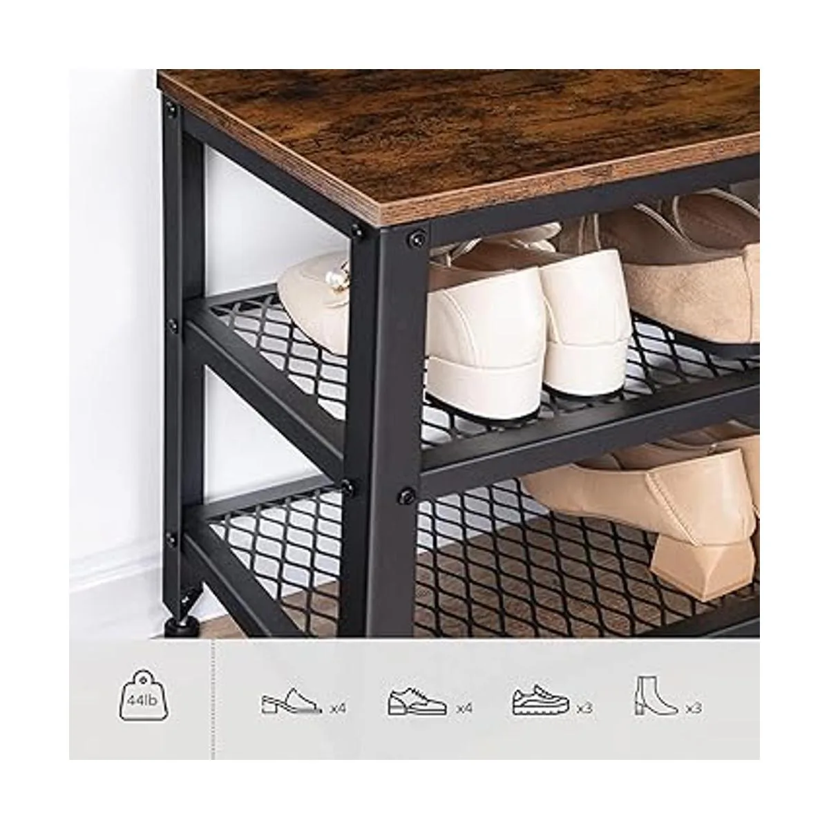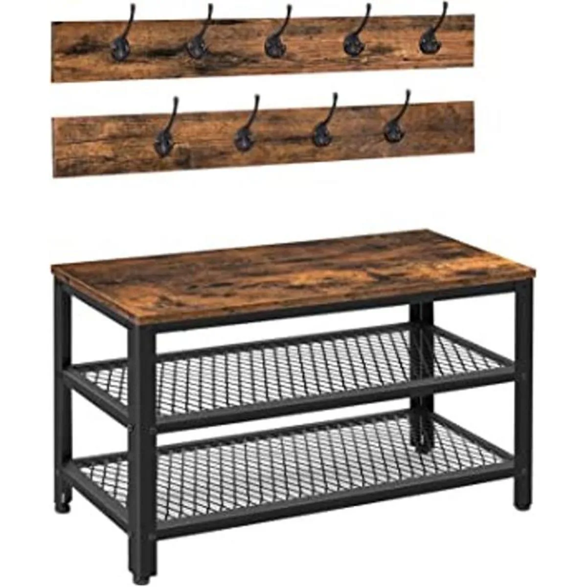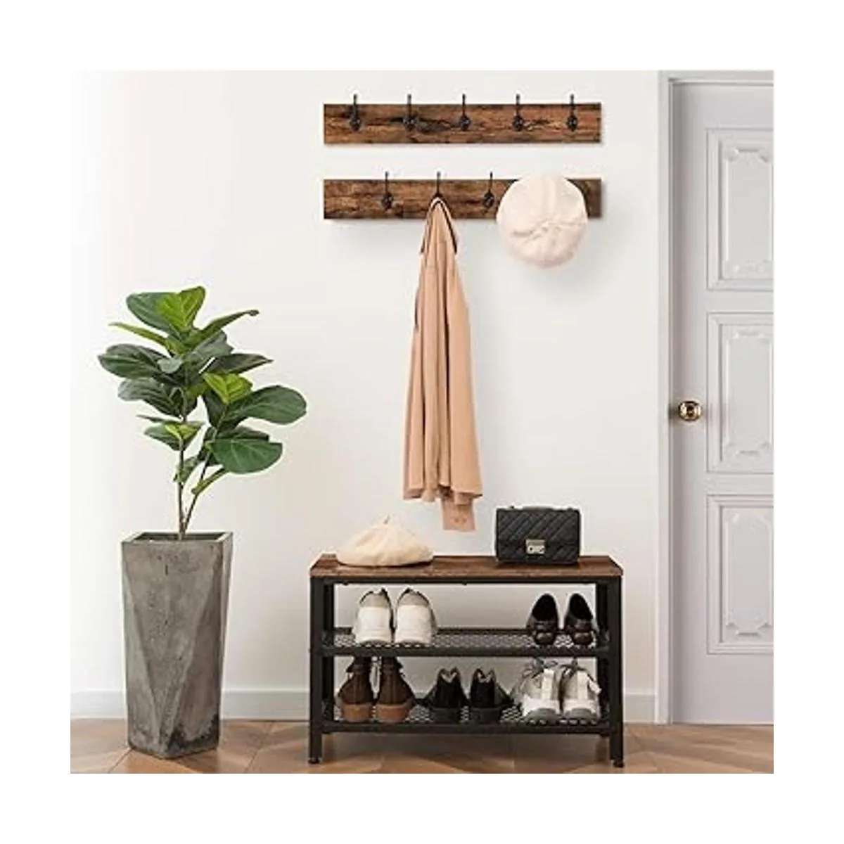 HOOBRO Banco de zapatos, banco de almacenamiento de entrada, organizador de zapatos con ganchos para abrigos, diseño 3 en 1, muebles de madera con marco de metal, marrón rústico y negro BF17MT01