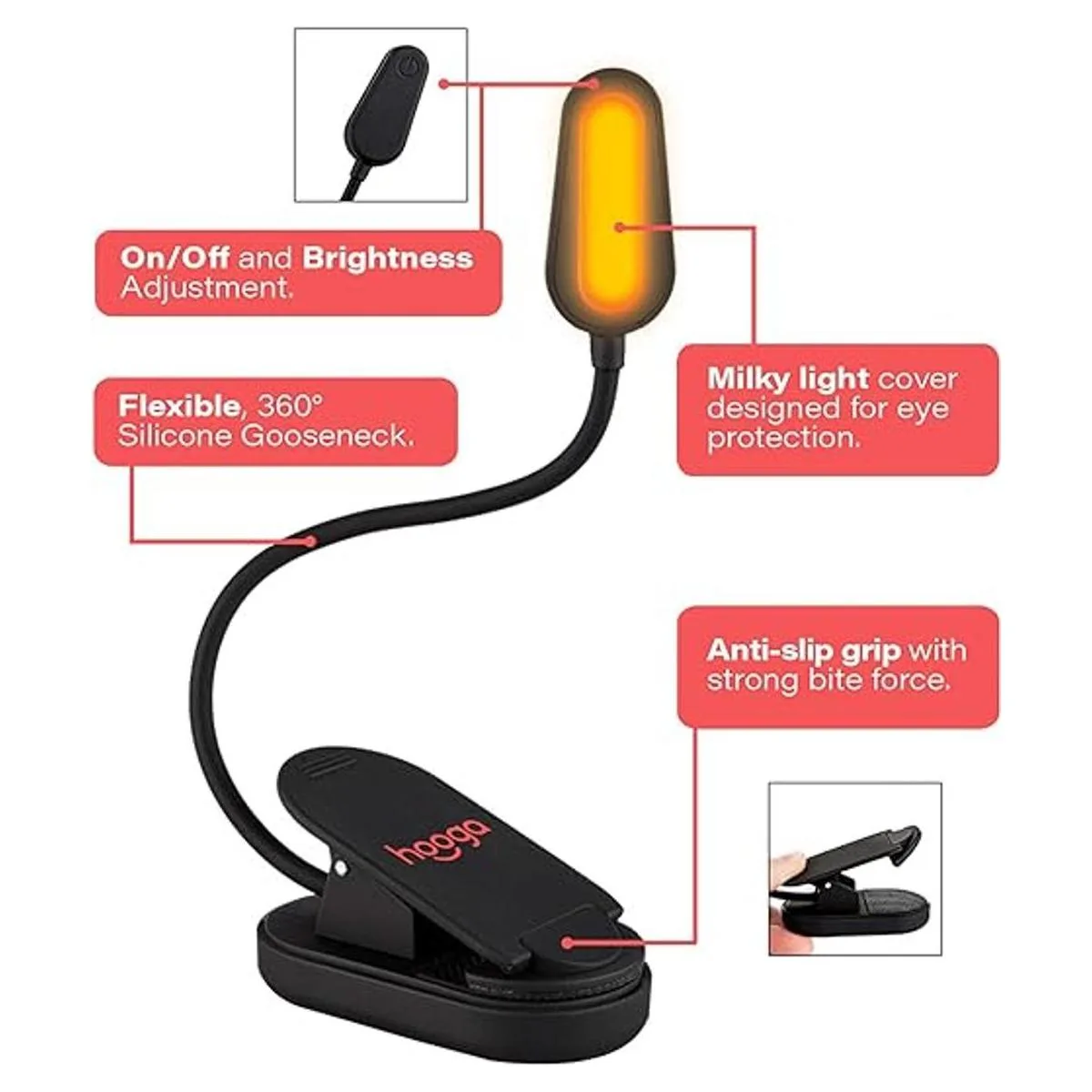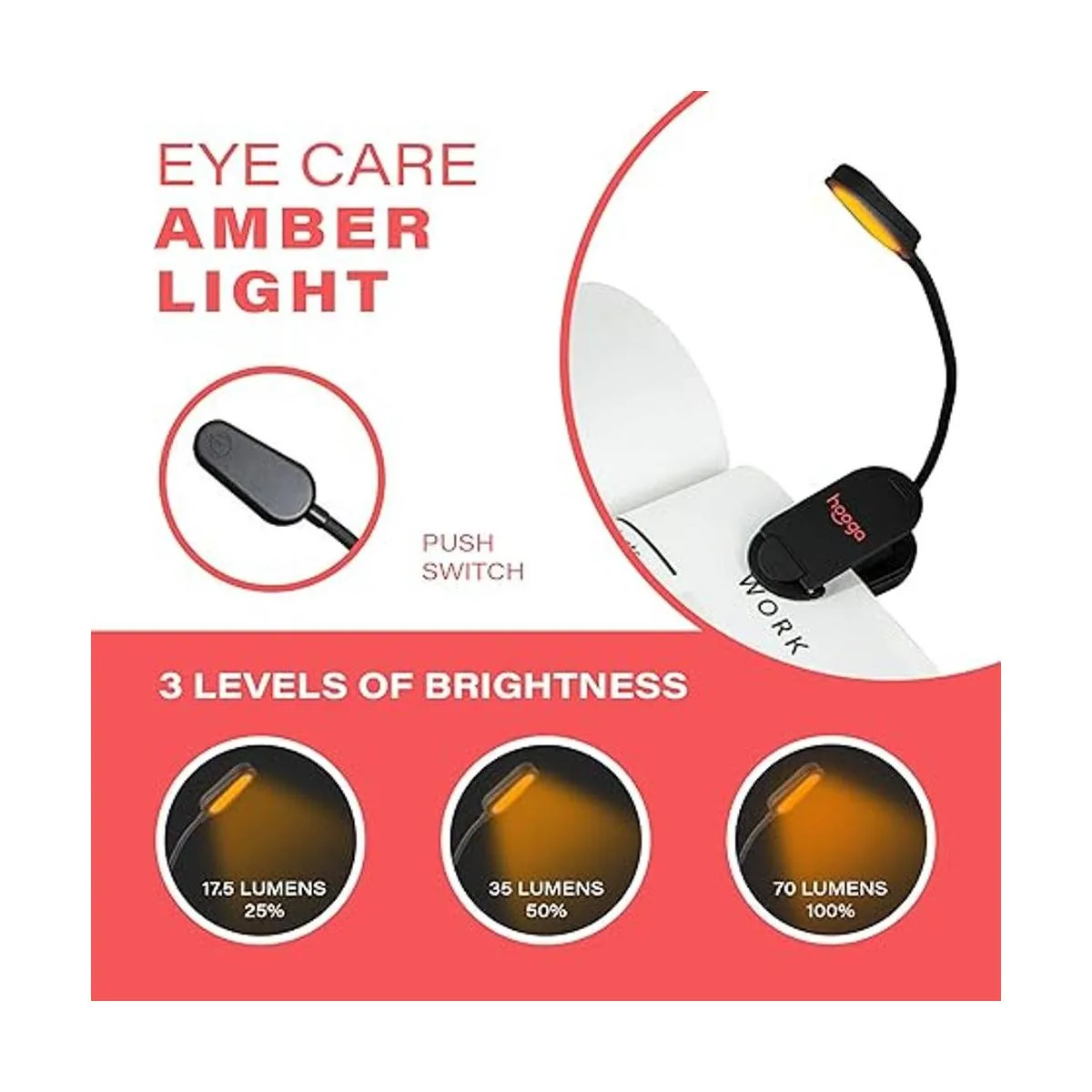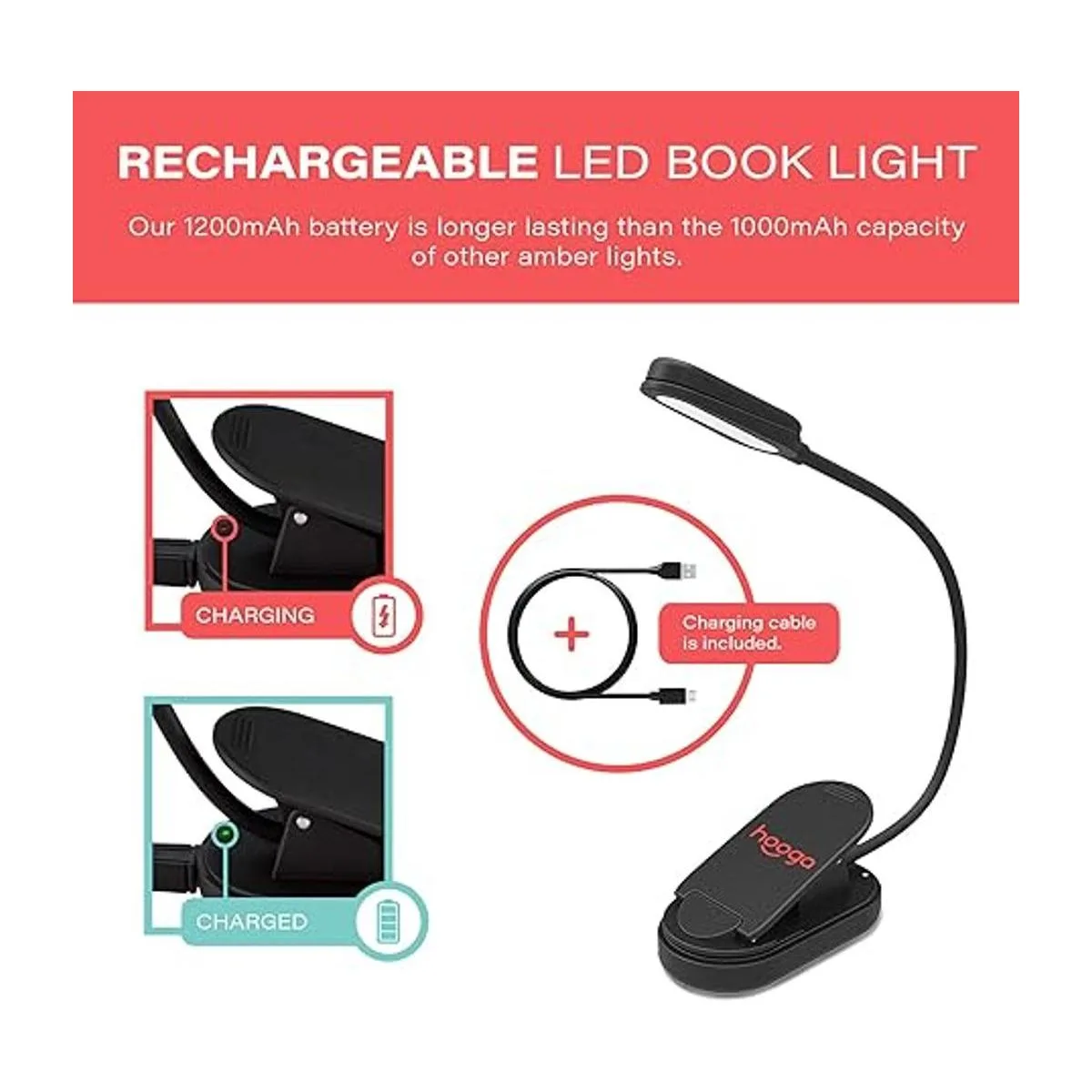Hooga, luz de lectura con clip, bloqueo de luz azul, color ámbar Luces led cálidas de 1600 K para leer en la cama. Favorece el sueño. Batería recargable de 1200 mAh. Brillo ajustable. Funciona con Kindle.