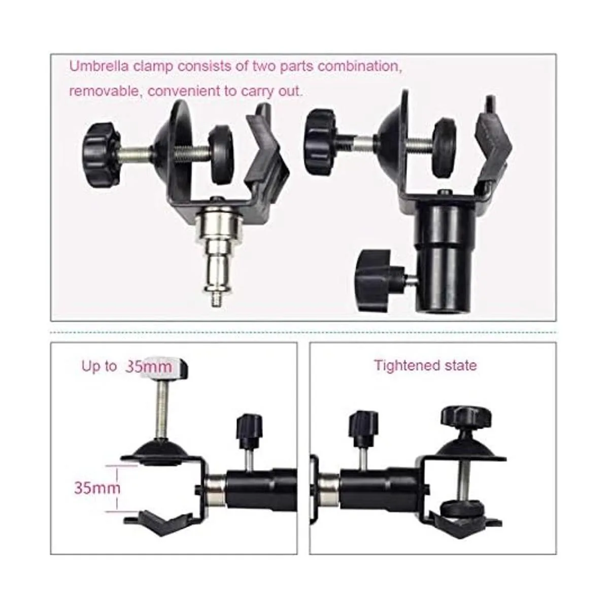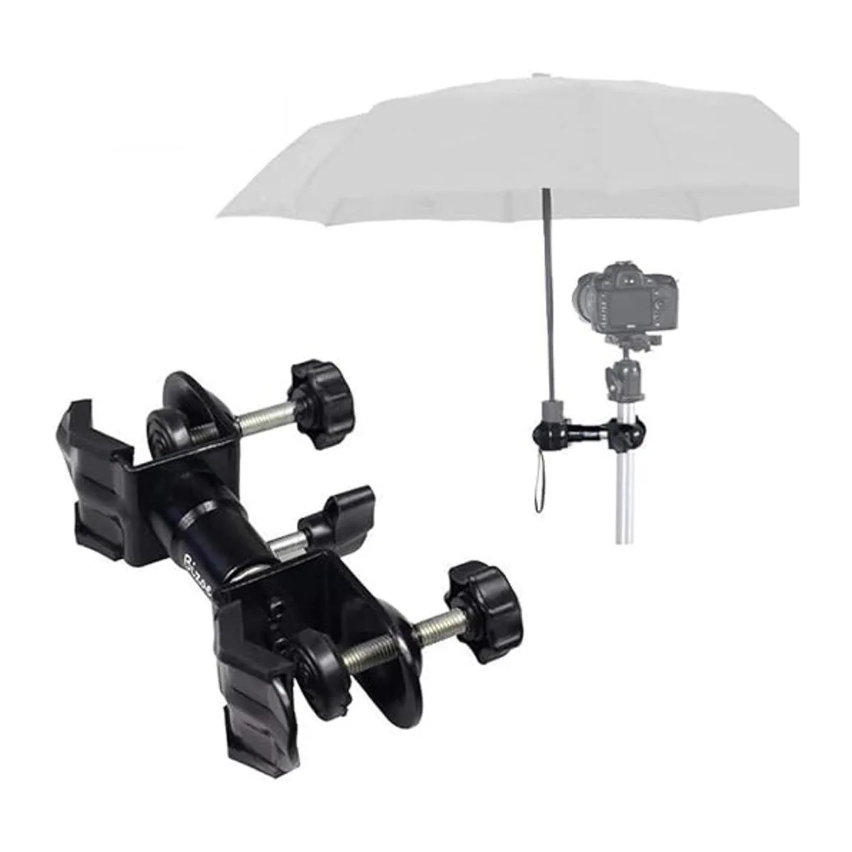 Clip de paraguas para cámara, un extremo para sujetar el eje del trípode, el otro extremo abrazadera mango del paraguas, se puede sujetar en el eje central del trípode o trípode