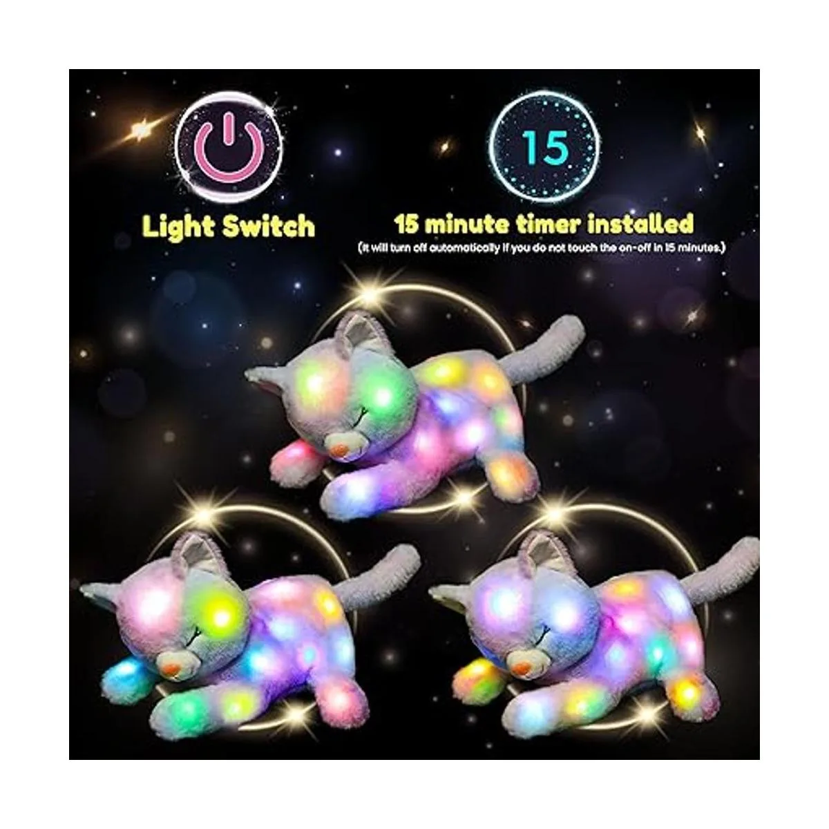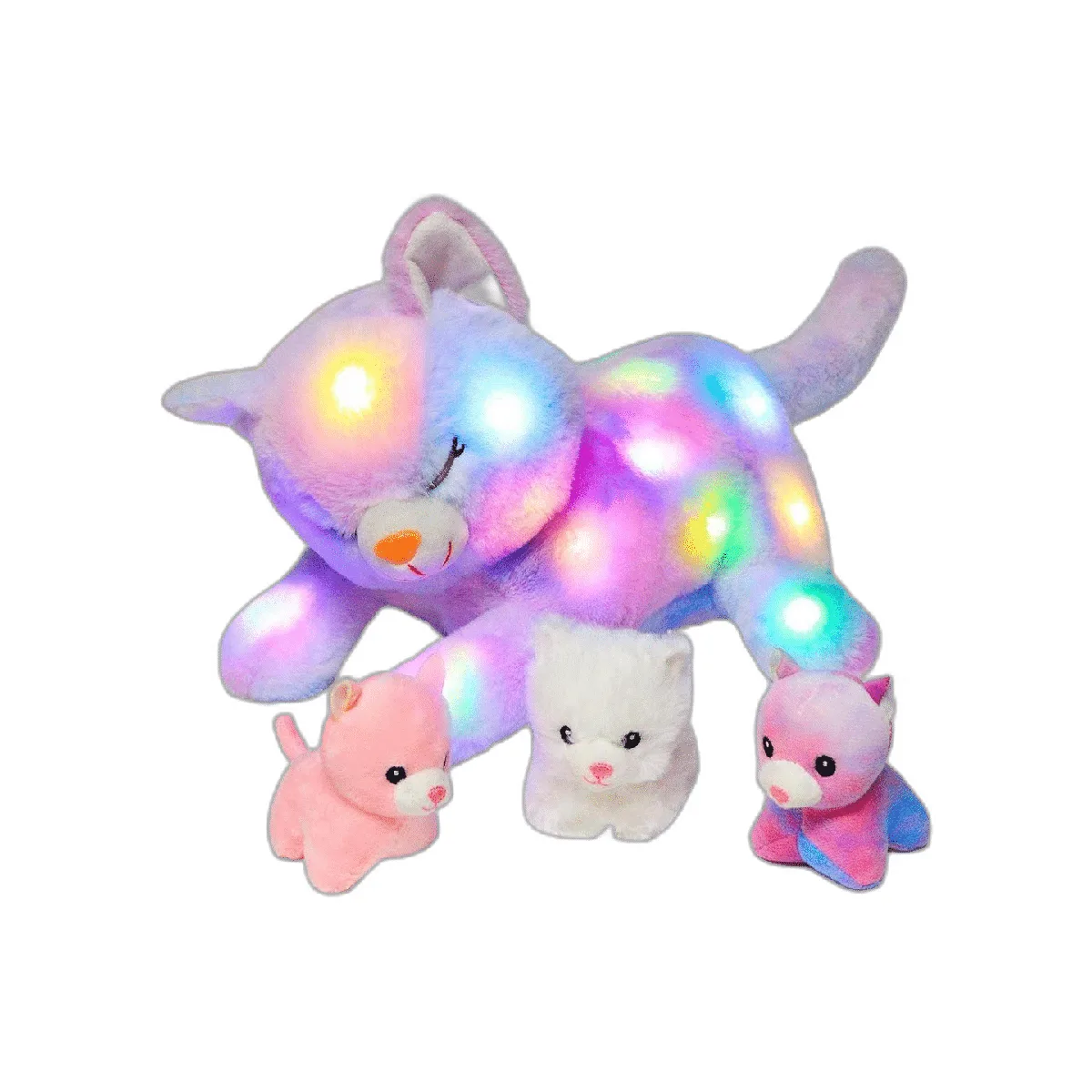 Hopearl Gato de peluche con luz LED para mamá, gato con 3 gatitos en su abdomen, juego de peluche con luces nocturnas que brillan en la oscuridad, regalos de cumpleaños para niños pequeños, arco iris, 18 pulgadas