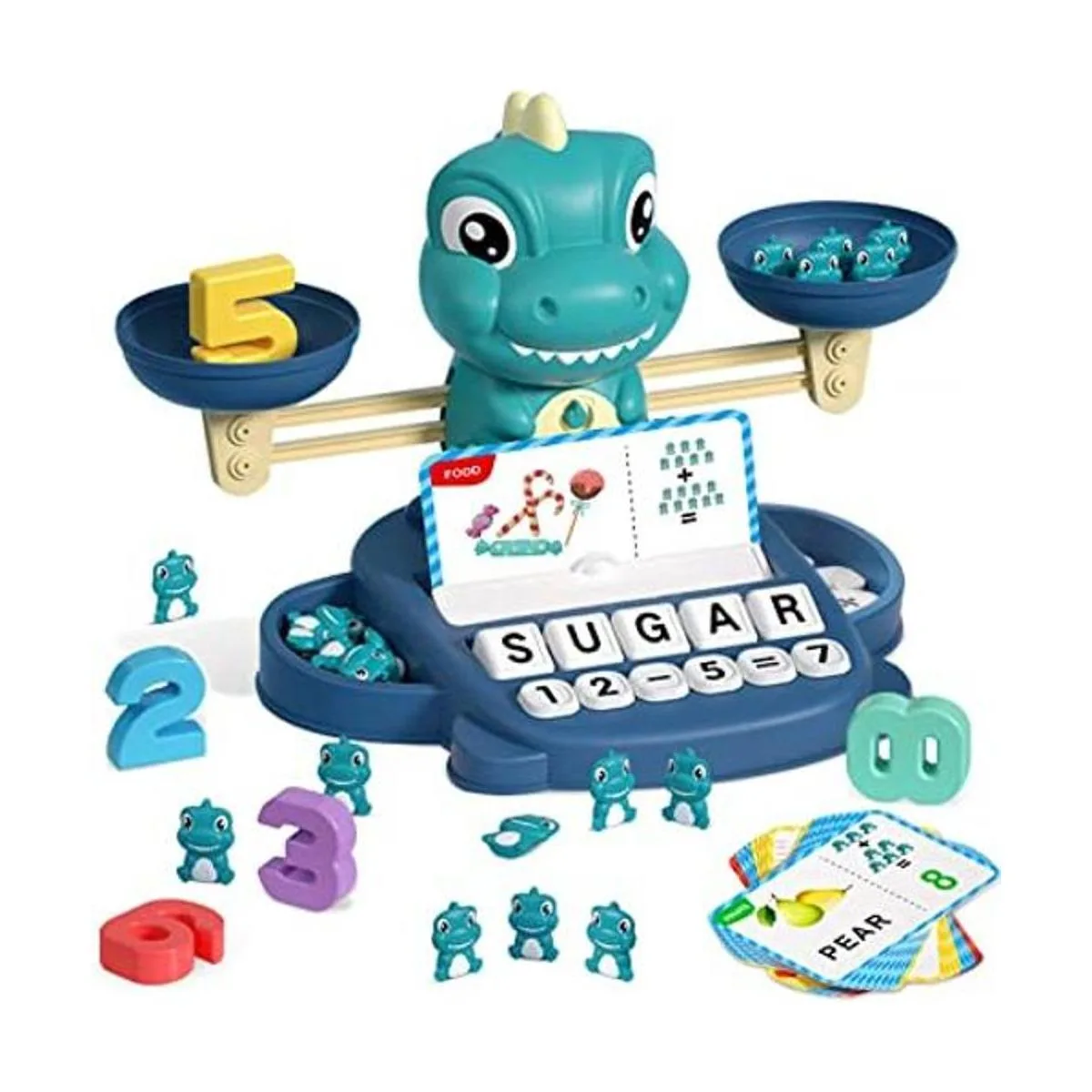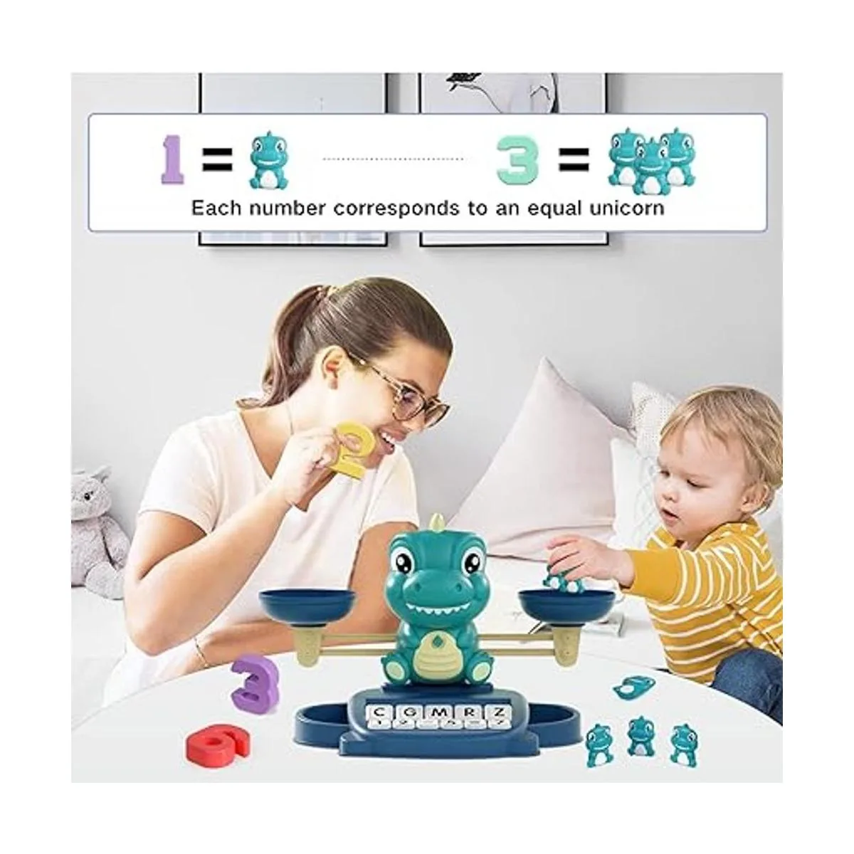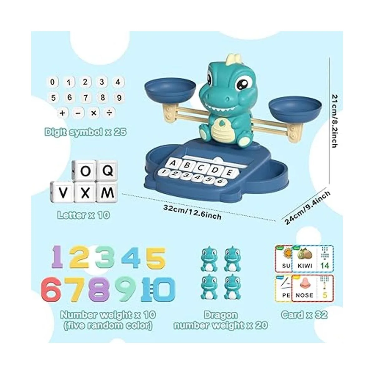 Equilibrio de dinosaurios: los juguetes de dinosaurio están hechos de plástico grueso ABS no tóxico de alta calidad y han pasado la prueba CPC de Estados Unidos, que es amigable con la salud de los niños. El paquete contiene: 1 equilibrio de dinosaurios, 10 pesos digitales coloridos, 20 pesos pequeños de unicornio, 32 tarjetas de imagen 64 palabras con 3,4 y 5 palabras de letra, 10 cubos de letras, 20 bloques de números, 5 bloques de símbolos matemáticos.