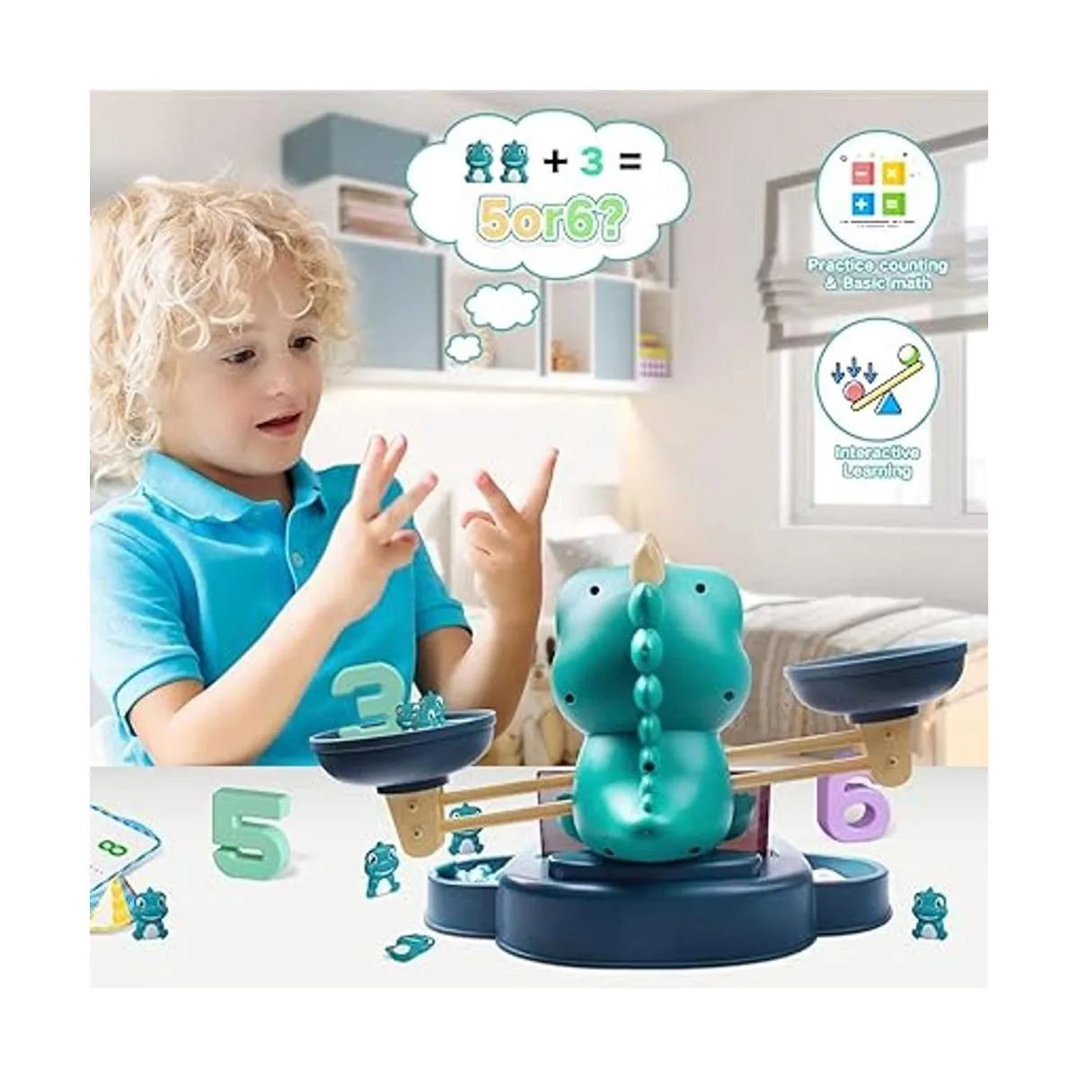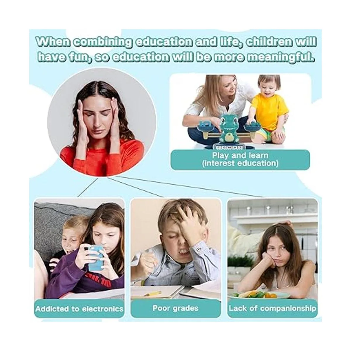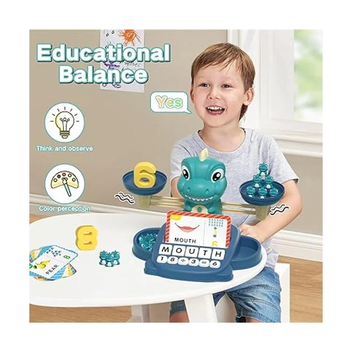 Equilibrio de dinosaurios: los juguetes de dinosaurio están hechos de plástico grueso ABS no tóxico de alta calidad y han pasado la prueba CPC de Estados Unidos, que es amigable con la salud de los niños. El paquete contiene: 1 equilibrio de dinosaurios, 10 pesos digitales coloridos, 20 pesos pequeños de unicornio, 32 tarjetas de imagen 64 palabras con 3,4 y 5 palabras de letra, 10 cubos de letras, 20 bloques de números, 5 bloques de símbolos matemáticos.