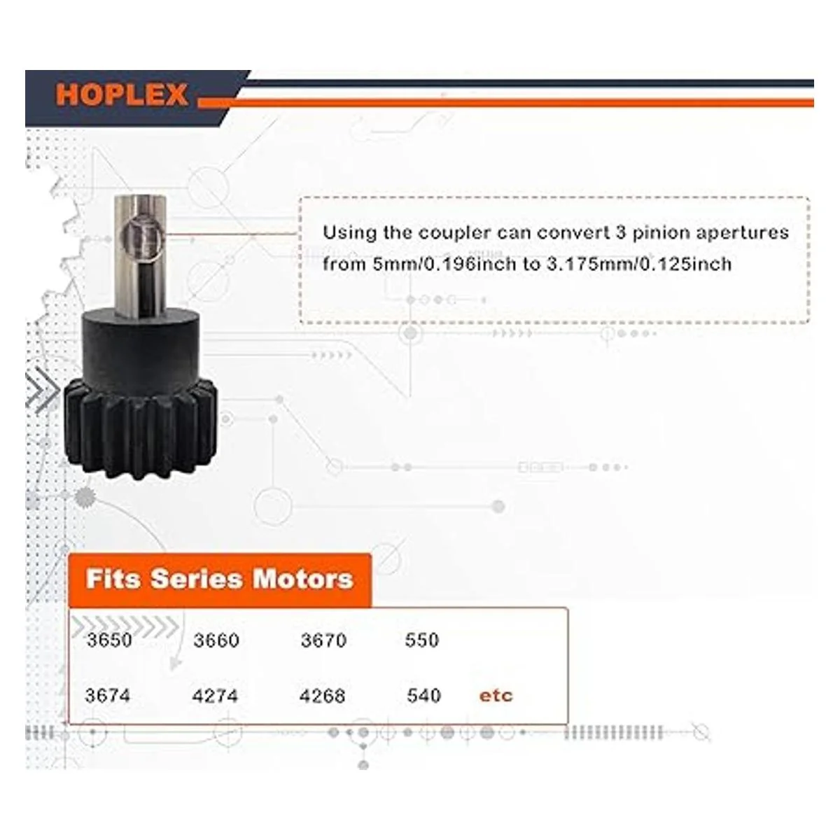 Piñones 15T/17T/19T: diámetro interior: 0.197 in, viene con acoplador de 0.125 in para convertir 3 aberturas de piñones a 0.125 in. Adecuado para motores de eje de 0.197 in y 0.125 in