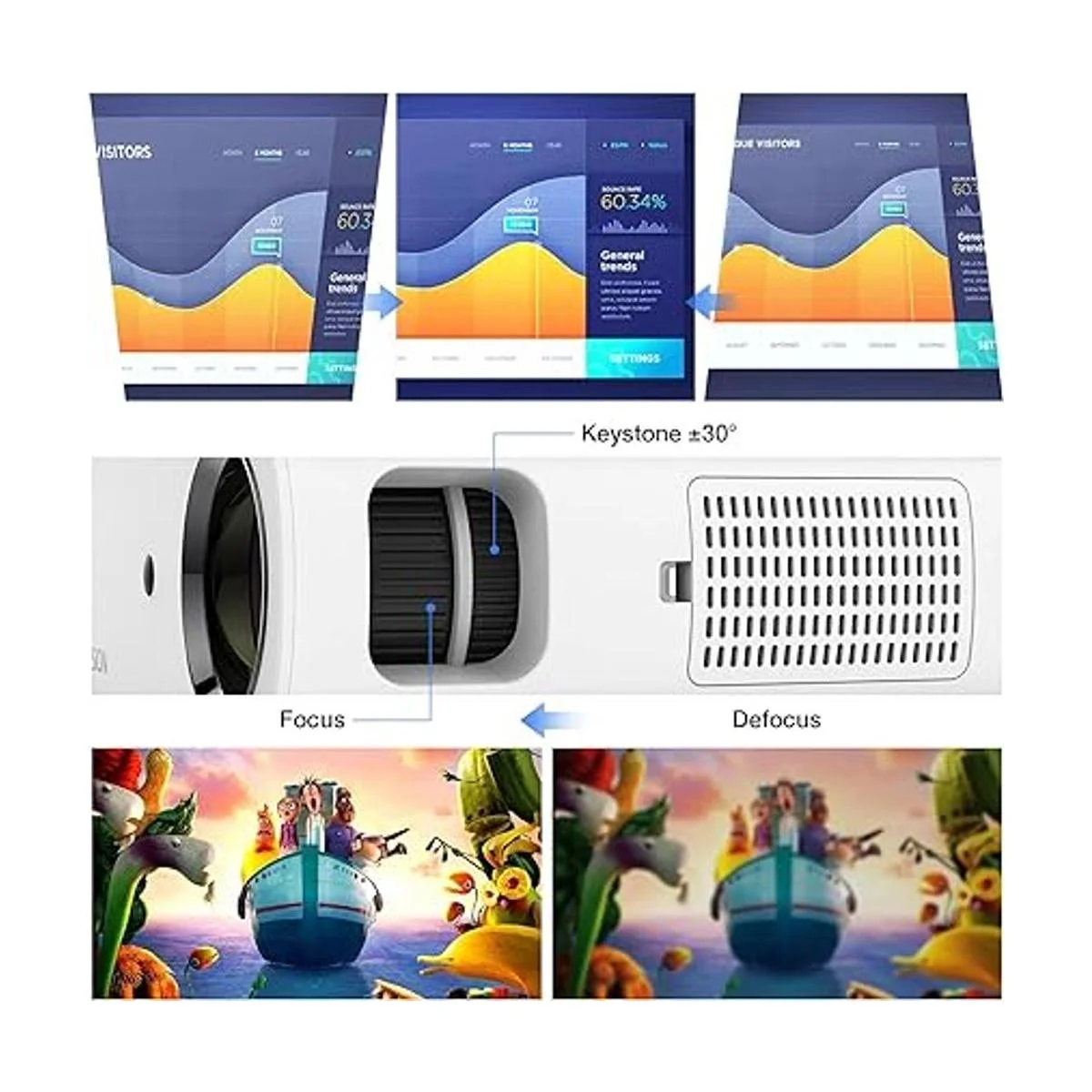 Experiencia de pantalla gigante de 350 pulgadas y sonido estéreo de alta fidelidad. Proyector gigante de 1080P Full HD que proyecta imágenes de hasta 350 pulgadas, disfruta de una experiencia de ver películas en pantalla grande. Altavoces estéreo duales integrados con sonido SRS, que te proporcionará agudos más altos, un alto preciso y graves potentes. Los potentes altavoces te ofrecen una experiencia diferente y sorprendente. Es como tener un cine en casa.