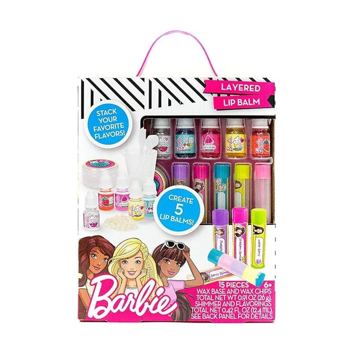 Horizon Group USA Barbie hace tu propio kit de bálsamo labial en capas, bricolaje 5 bálsamos labiales personalizados mezclando sabores como vainilla, fresa, sandía y ponche tropical, multicolor