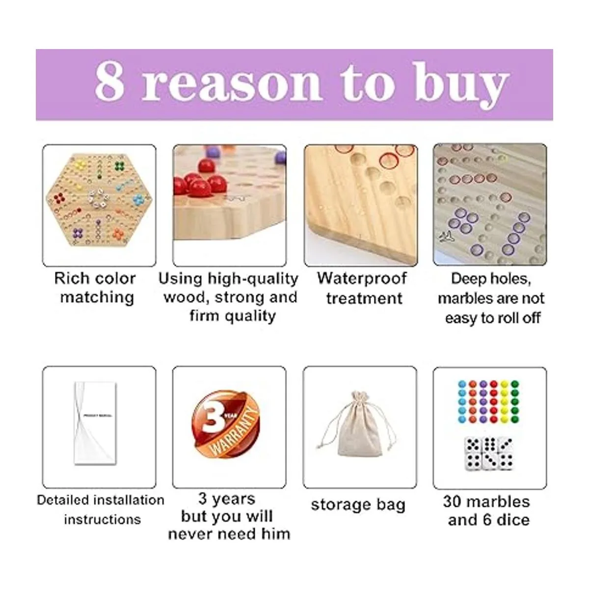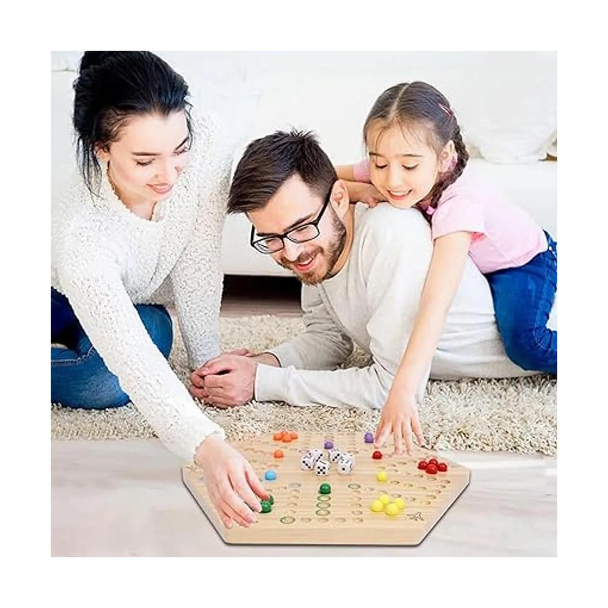 HOROW Juego de mesa Wahoo de mármol original, juego de mesa de madera pintado de doble cara para 6 y 4 jugadores, 6 colores, 24 canicas, 6 dados para familiares y fiestas roble