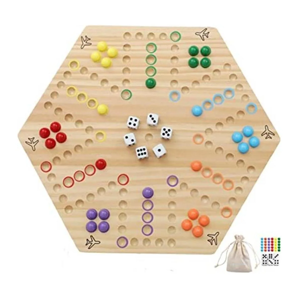 Juego clásico: nuestro juego de mesa de mármol de madera tiene un diseño pintado de doble cara y un bonito patrón de avión, adecuado para 4 o 6 jugadores, 24 canicas coloridas 4 de cada uno de los 6 colores, 6 dados, almacena canicas y bolsa de terciopelo con cordón, manual de instrucciones idioma español no garantizado, 16 x 14 x 0.75 pulgadas, fácil de llevar.