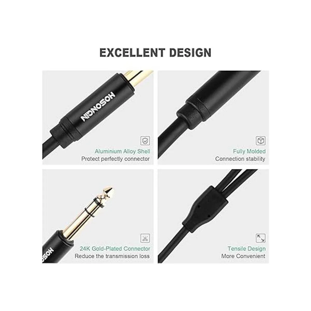 HOSONGIN El cable divisor estéreo de 1/4 pulgadas utiliza un proceso totalmente moldeado y blindado para mejorar la durabilidad y la estabilidad, evitar interferencias EMI/RFI.