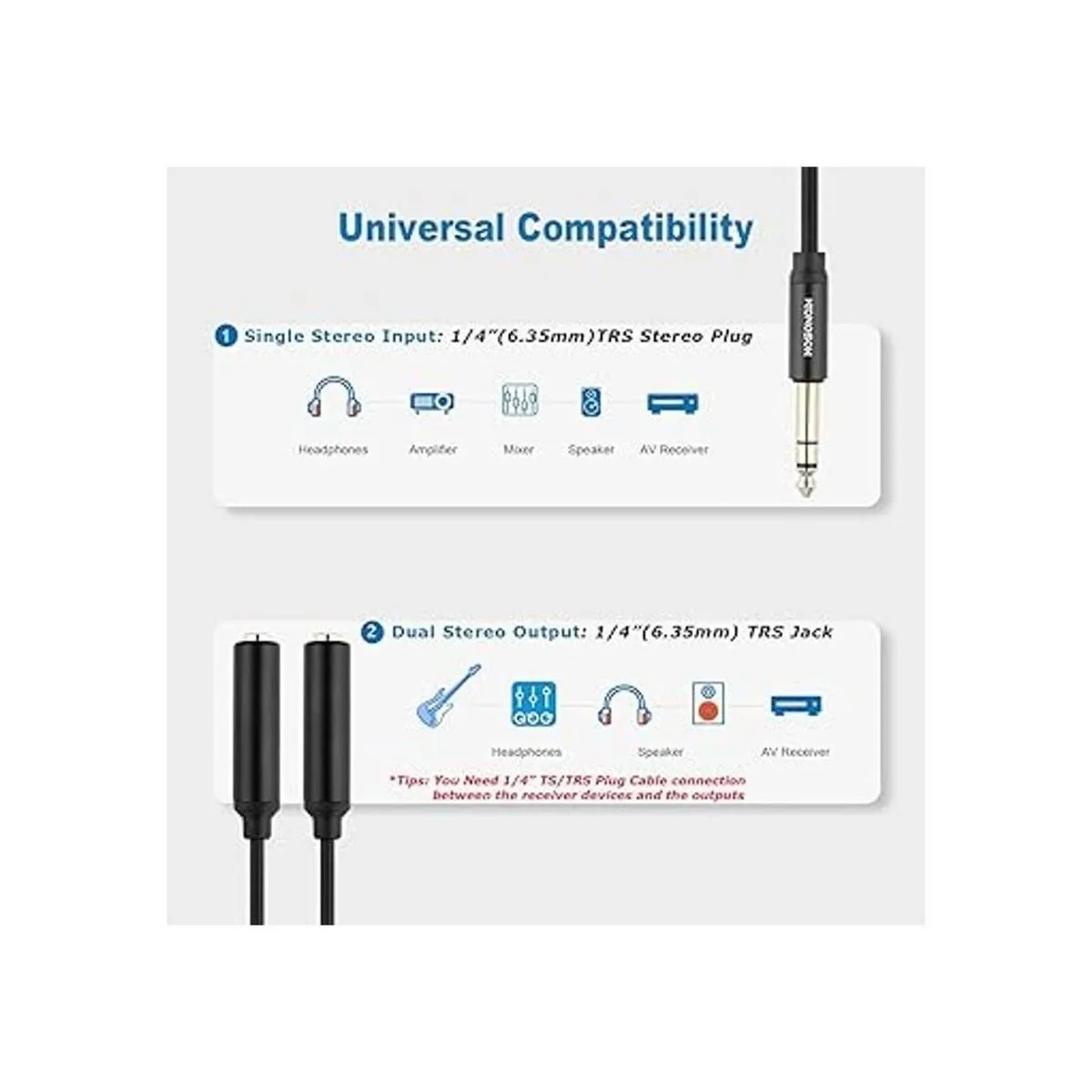 HOSONGIN El cable divisor estéreo de 1/4 pulgadas tiene un enchufe estéreo TRS de 0.250 in y dos conectores estéreo hembra de 1/4 pulgadas, te ayuda a dividir un estéreo en dos estéreos. Nota importante: no se puede combinar dos salidas en una sola entrada.