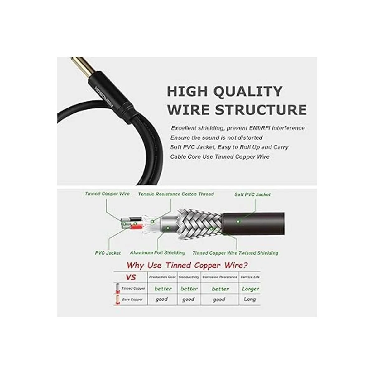 HOSONGIN El cable divisor estéreo de 1/4 pulgadas utiliza alambre de cobre estañado de alta calidad y conectores chapados en oro, transmite sonido de alta calidad, fuerte y resistente.