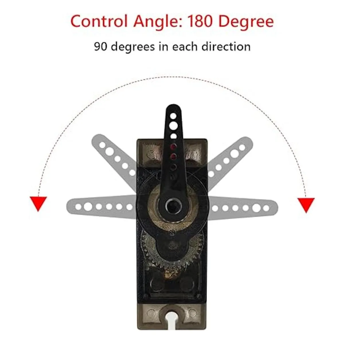 El ángulo de rotación es de aproximadamente 180 grados 90 grados en cada dirección. La velocidad de rotación es de 0,1 segundos/60 grados 4,8 v, 0,08 segundos/60 grados 6 v.