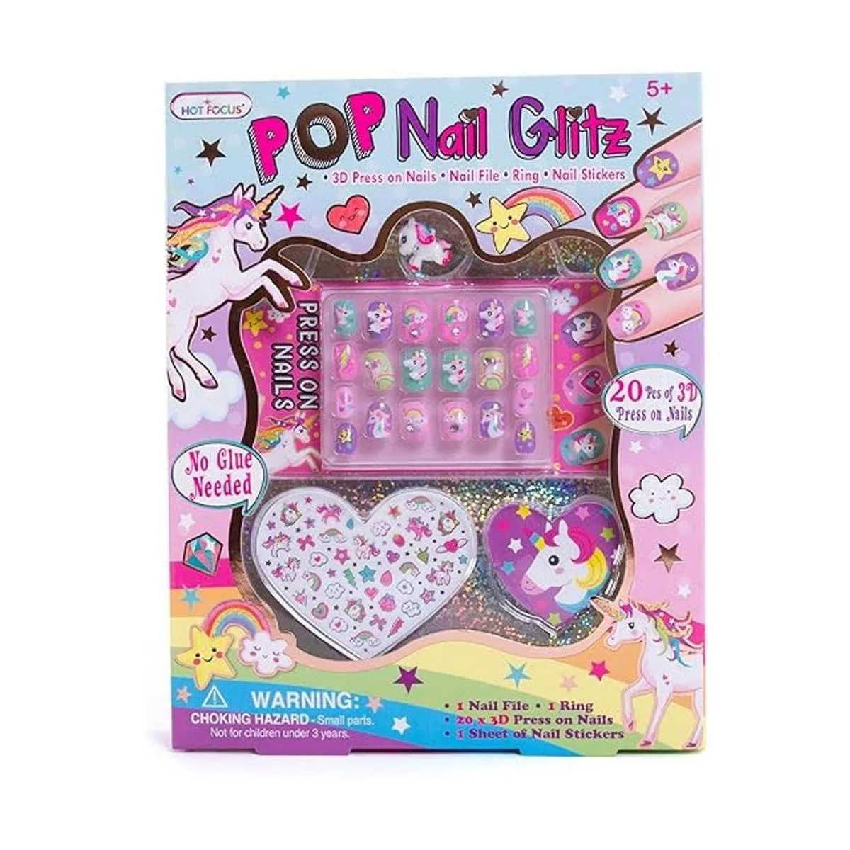 Hot Focus Pop Nail Glitz Kit de arte de uñas de unicornio 3D para niñas, juego de 65 piezas que incluye uñas 3D, calcomanías de uñas, lima de uñas y anillo