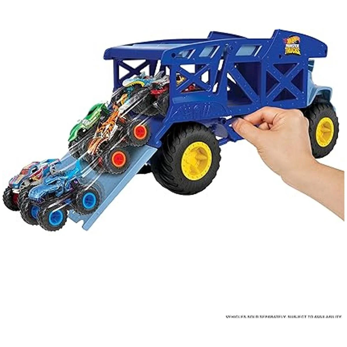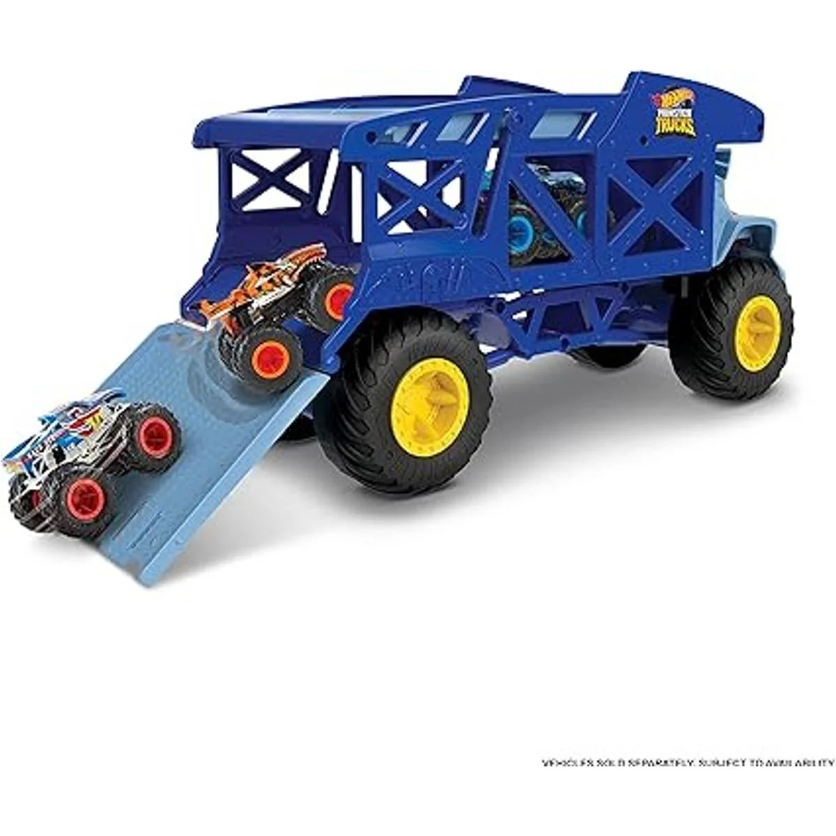Hot Wheels Monster Trucks Monster Mover Rhino, vehículo de juguete, soporta 12 camiones monstruos a escala 164 o 32, con lanzamiento de rampa, regalo para niños de 3 años en adelante