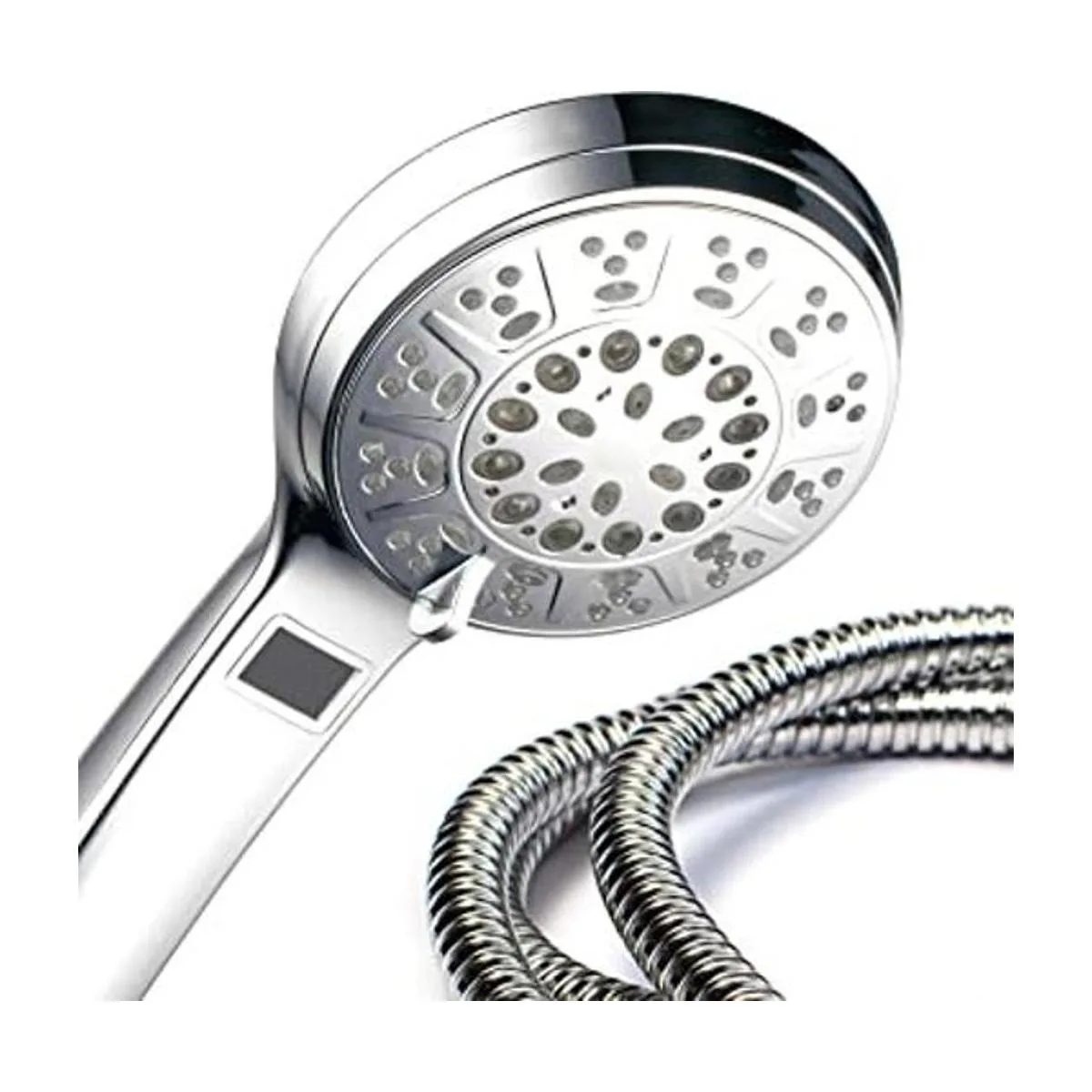 5 ajustes de potencia de lluvia, masaje de, Mist, hidratante y economía de agua lluvia y modos de pausa 3zone precisión spiralflo Dial con conductos de goma clickaction palanca Color de luces LED cambia automáticamente de acuerdo con la temperatura del agua Incluye angleadjustable Overhead soporte y Extraflexible manguera de acero inoxidable con doble manguera de latón de tuercas cónicas para fácil mano apriete