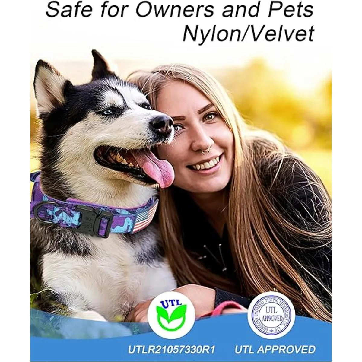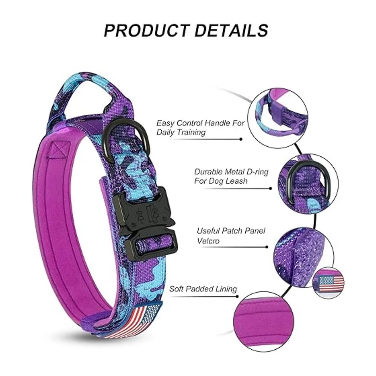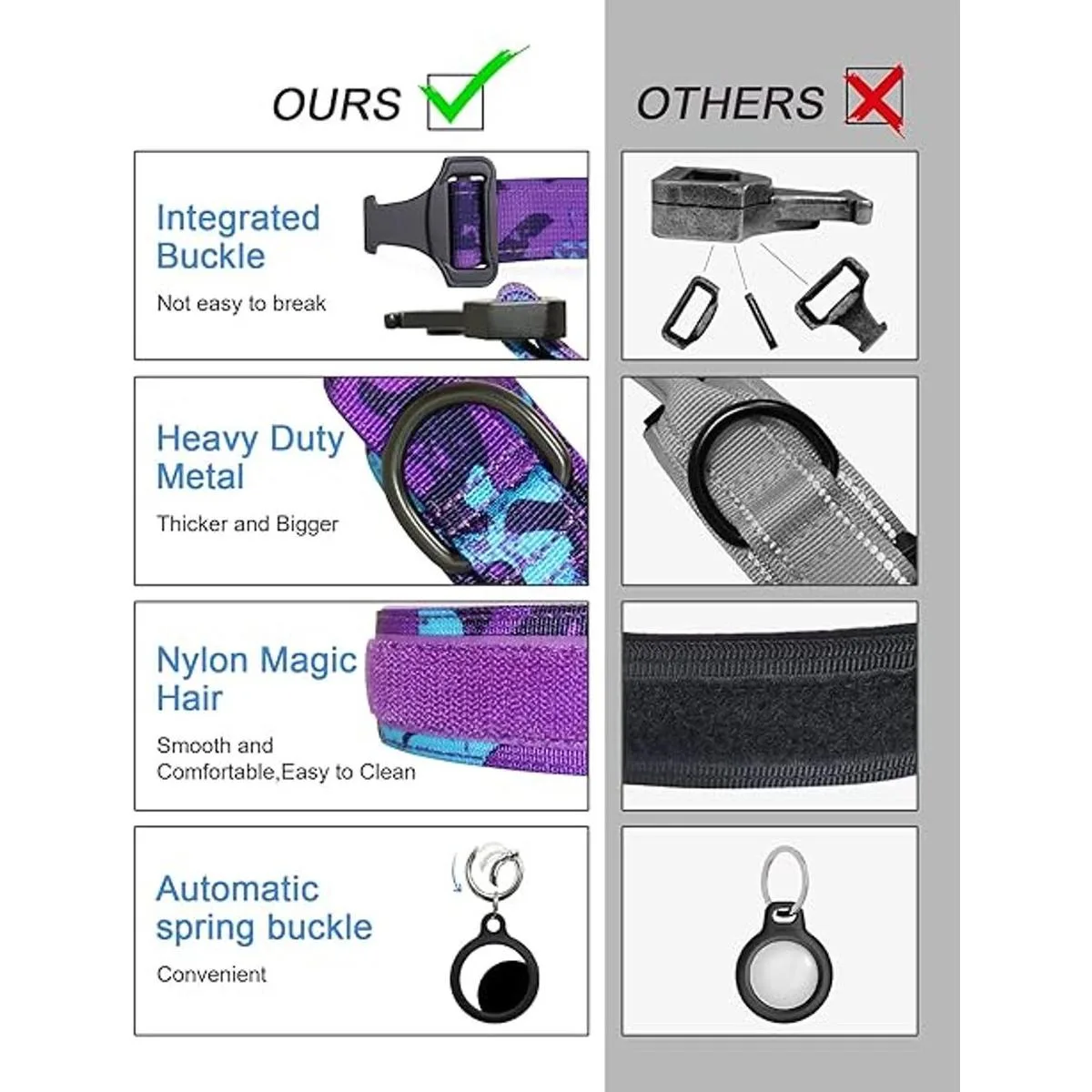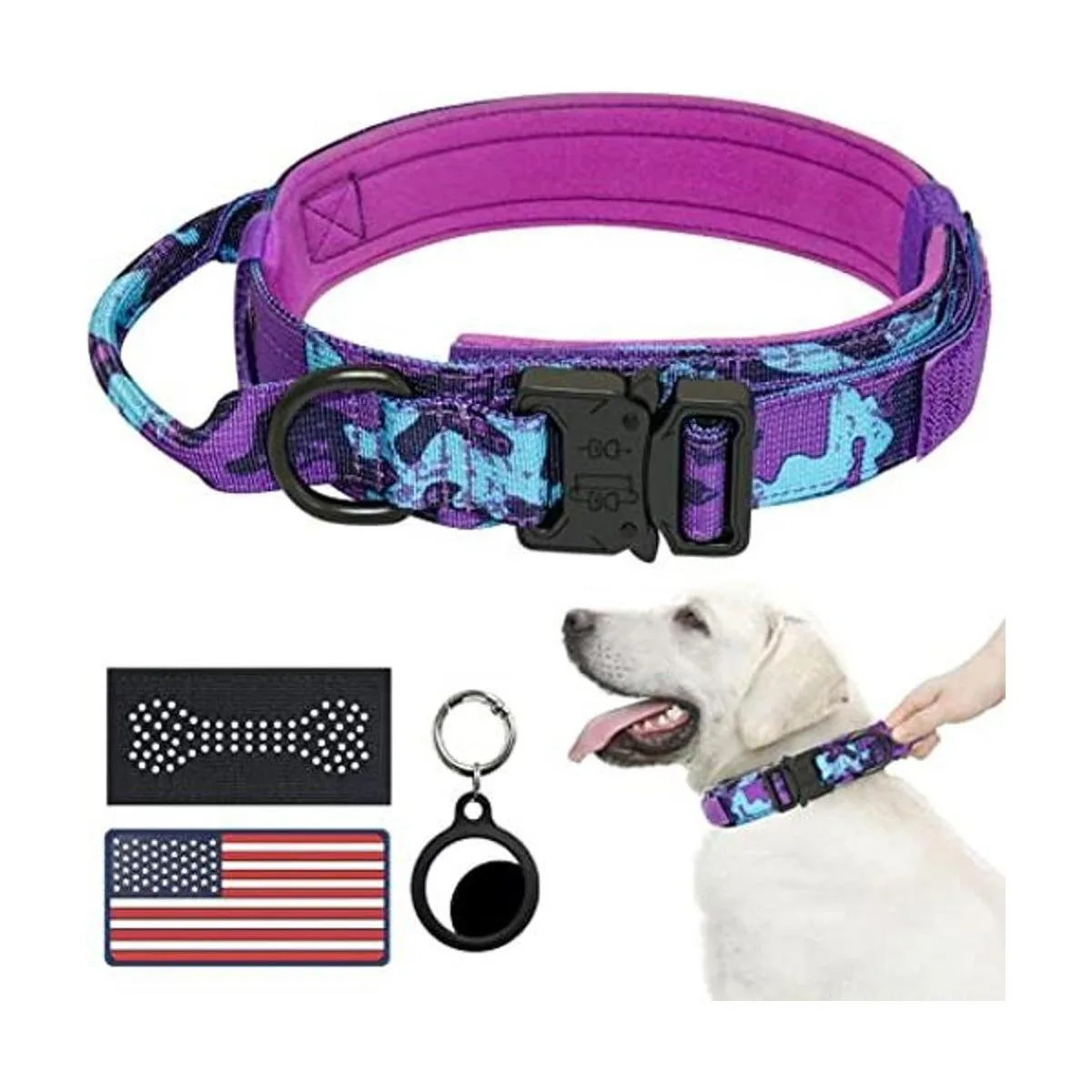 Hotsky Collar táctico para perro, collar ajustable de nailon con asa y hebilla de metal resistente para perros medianos y grandes, con soporte para AirTag y dos parches camuflaje morado, M