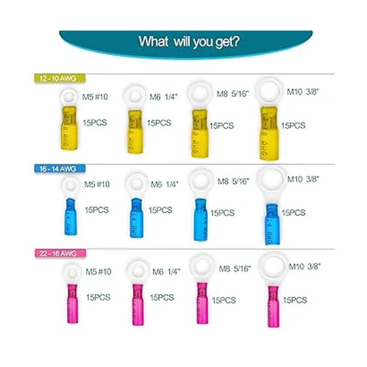 Housun 180 conectores de cable termorretráctil, kits de terminales de anillo, conectores de terminales de anillo marino automotriz para 10, 12, 14, 16, 18, 22 AWG