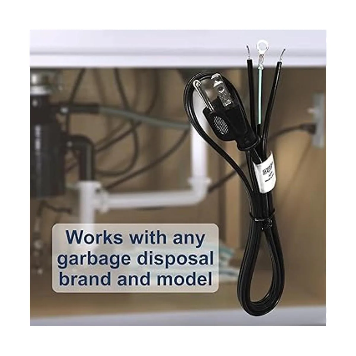 Este kit de cable de alimentación es fácil de instalar e incluye un cable de tres pies, abrazadera de alivio de tensión y conectores de cable. Una vez instalado, el desechador se conecta a una toma de pared estándar