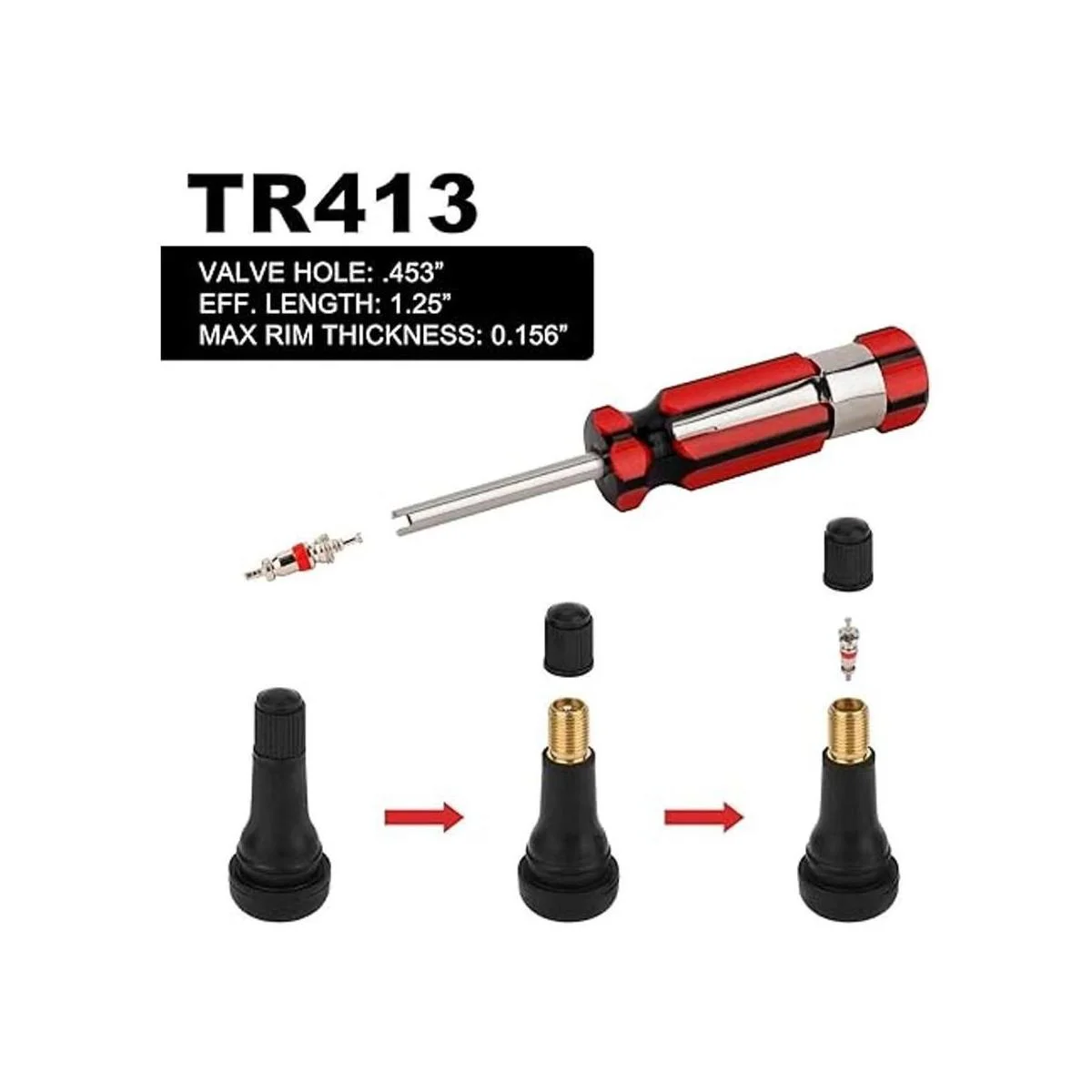 Vástago de válvula TR413: vástago de válvula de neumático de coche de goma a presión para agujeros de llanta sin cámara de 0.453 pulgadas 0.453 in de diámetro. La goma EPDM exterior es para resistencia al ozono. Aplicar para una presión máxima de inflado en frío de 65 PSI y un grosor máximo de borde de 0.156 pulgadas. Se adapta a coches, camiones ligeros, remolques pequeños, carretillas, cortacésped, ATV y motocicletas.