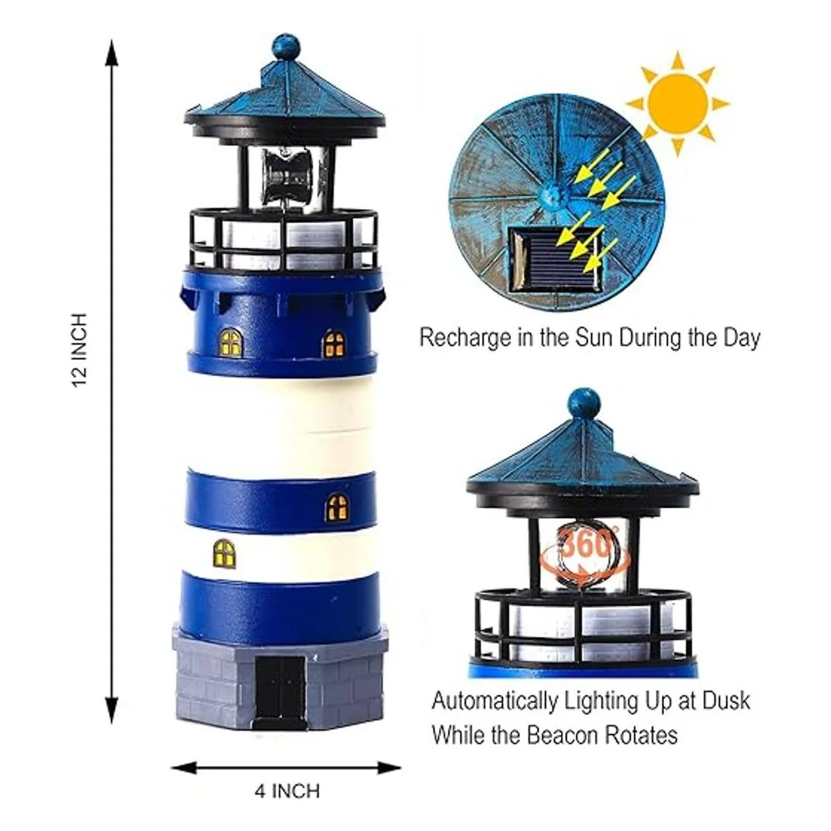 Diseño de faro solar: con luz LED giratoria en la parte superior del faro, alimentado por energía solar, carga al sol durante el día y se ilumina automáticamente al anochecer, mientras que el faro gira. Es un complemento decorativo perfecto para el jardín