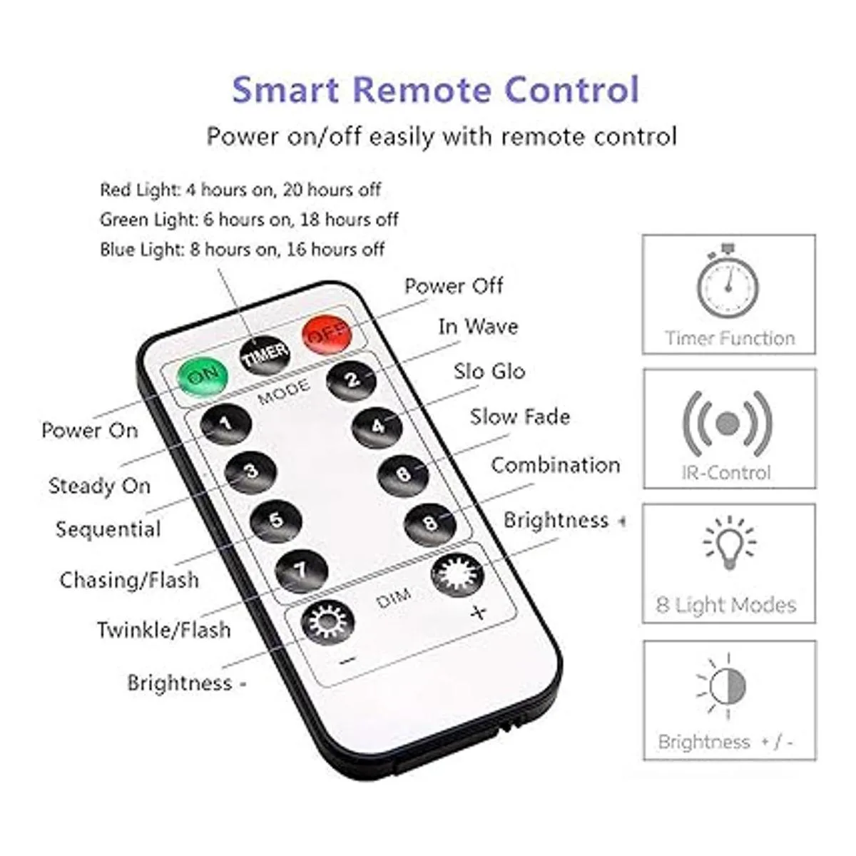 Luces de hadas con control remoto Viene con control remoto, fácil de ajustar los 5 niveles de brillo de estas luces parpadeantes y cambiar entre 8 modos de iluminación. 3 funciones de temporización: retardo de apagado 4H/6H/8H, que se ciclará automáticamente durante 24 horas.